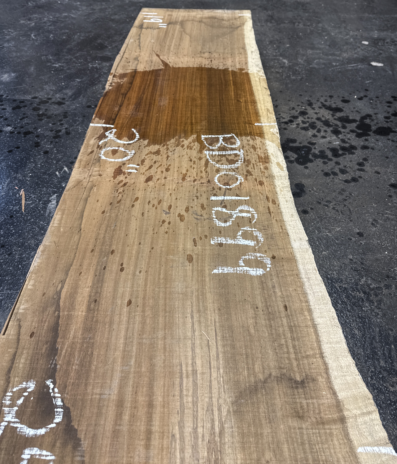 Great slab with one live edge and some curly figure beside it beautiful color and straight grain. It has some checking along the straight edge and a little brown rot in the butt end. Light twist.