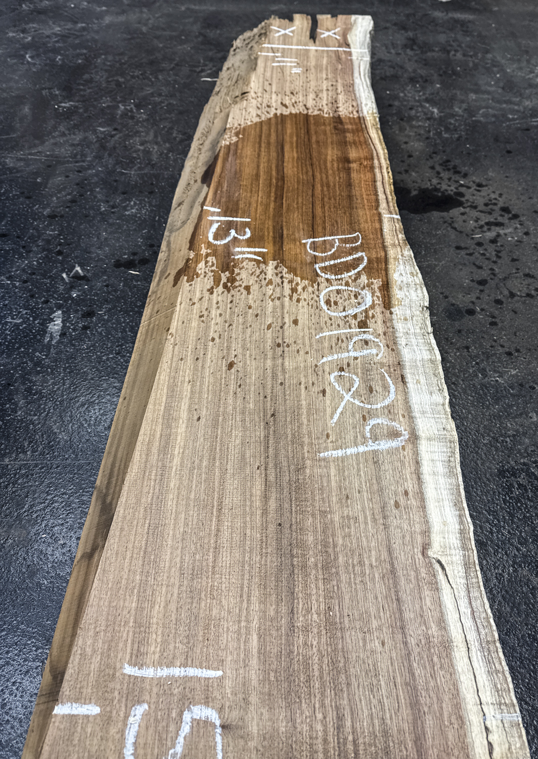 Great slab with one live edge and light curly figure beside it. It has straight grain and beautiful color. It has some end checking but is otherwise clear. Light twist planed to 2.20″.
