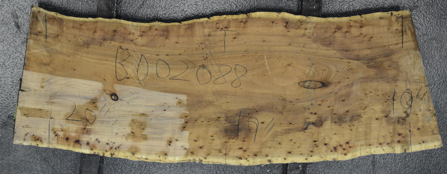 Live edge slab with lots of pock marks with a little curly figure in the edges and contrasting dark and light streaks. It does have some twist.