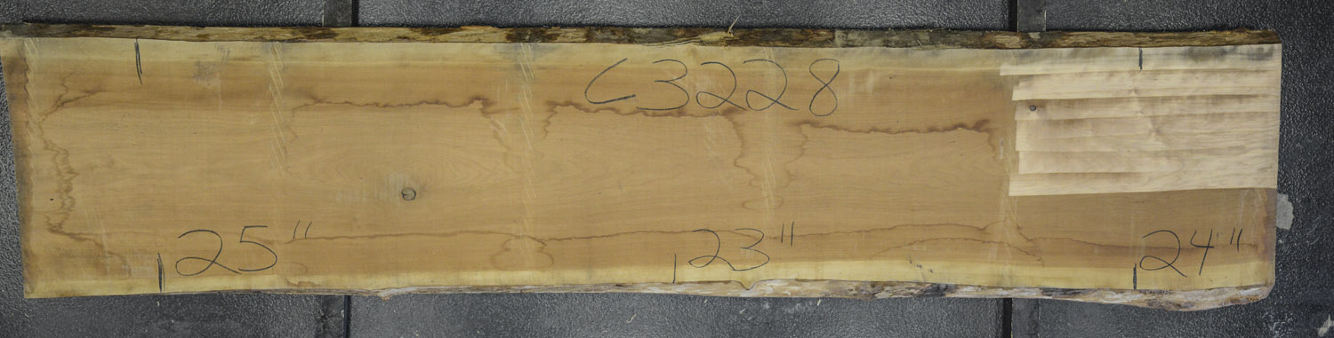 Great live edge slab with light figure and a couple knots. It also has some twist.
