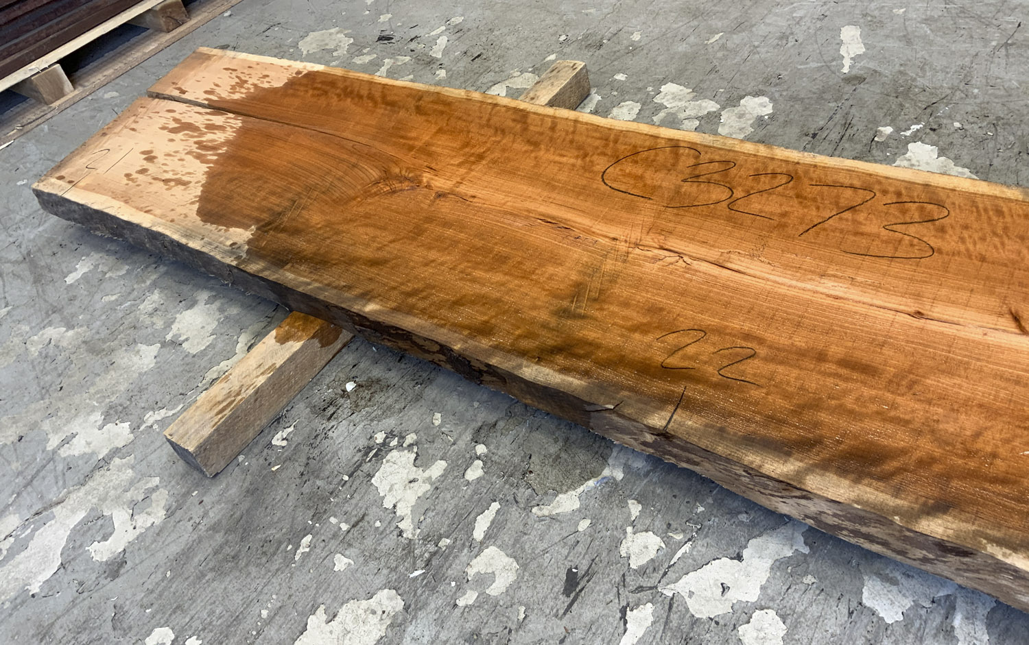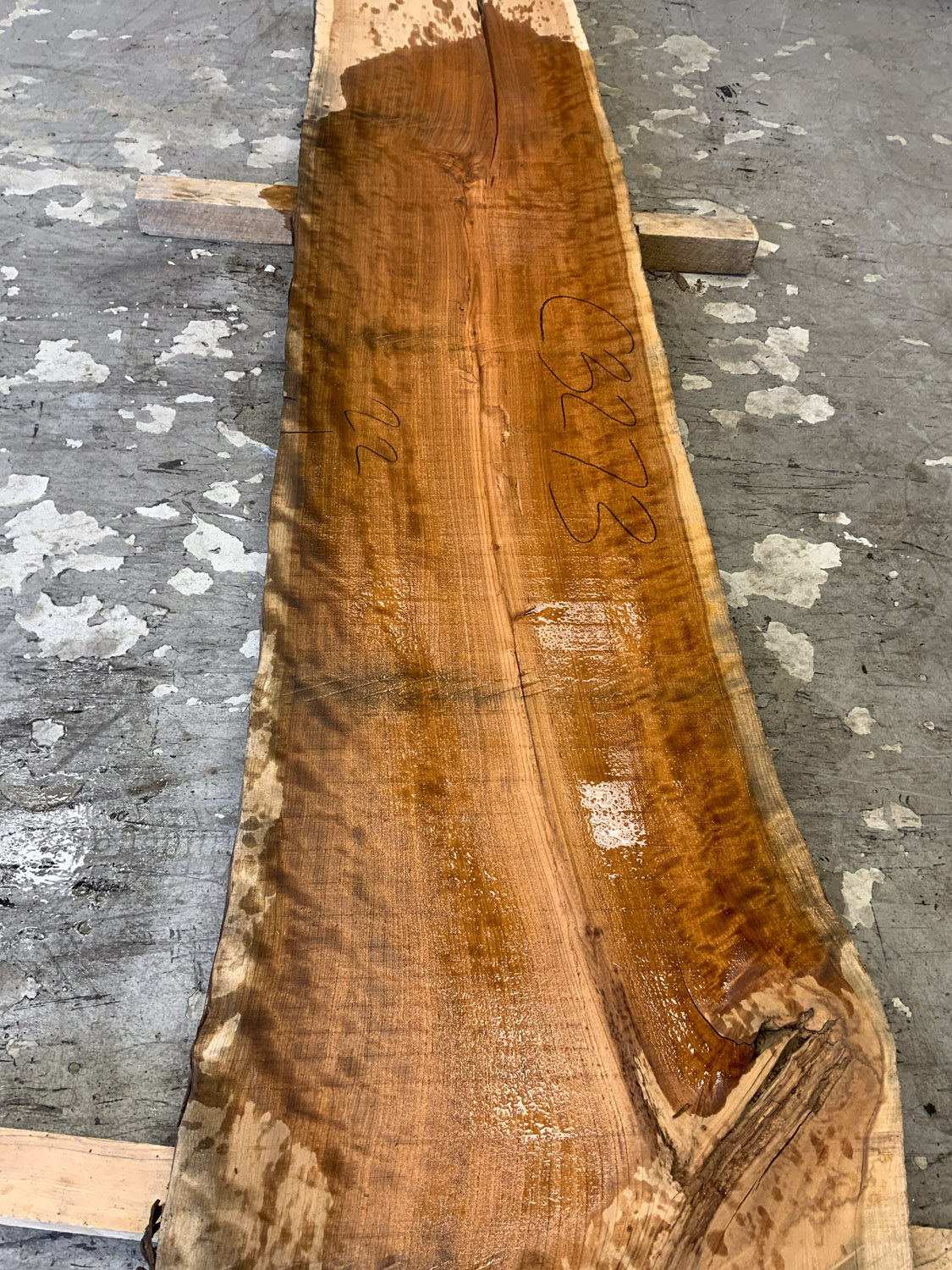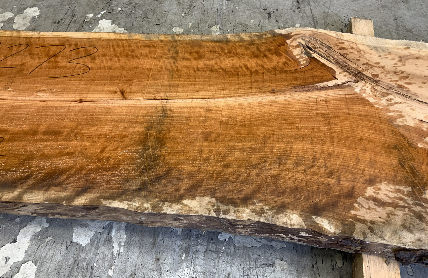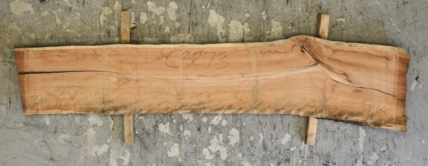 Cherry slab with beautiful figure and color. A twist is present so best if not used at full length. This board is the pith cut and it does contain the large checks and knots typical of pith boards.