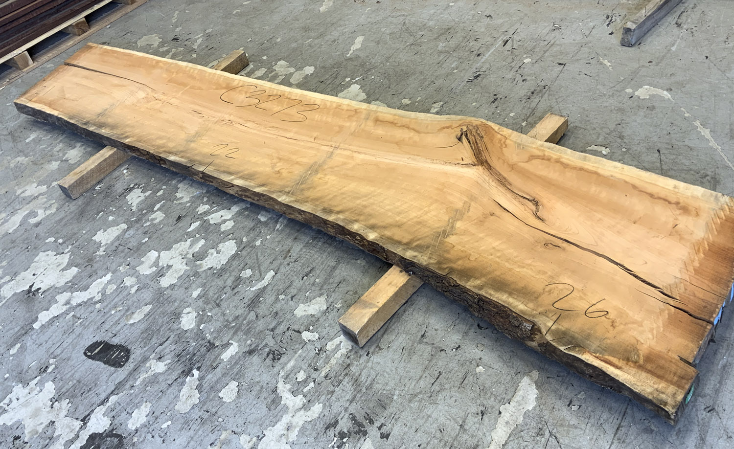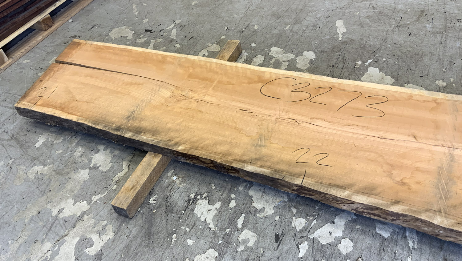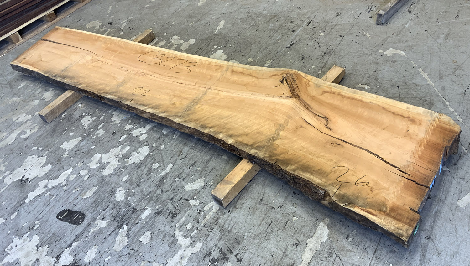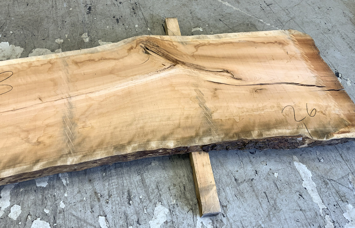 Cherry slab with beautiful figure and color. A twist is present so best if not used at full length. This board is the pith cut and it does contain the large checks and knots typical of pith boards.