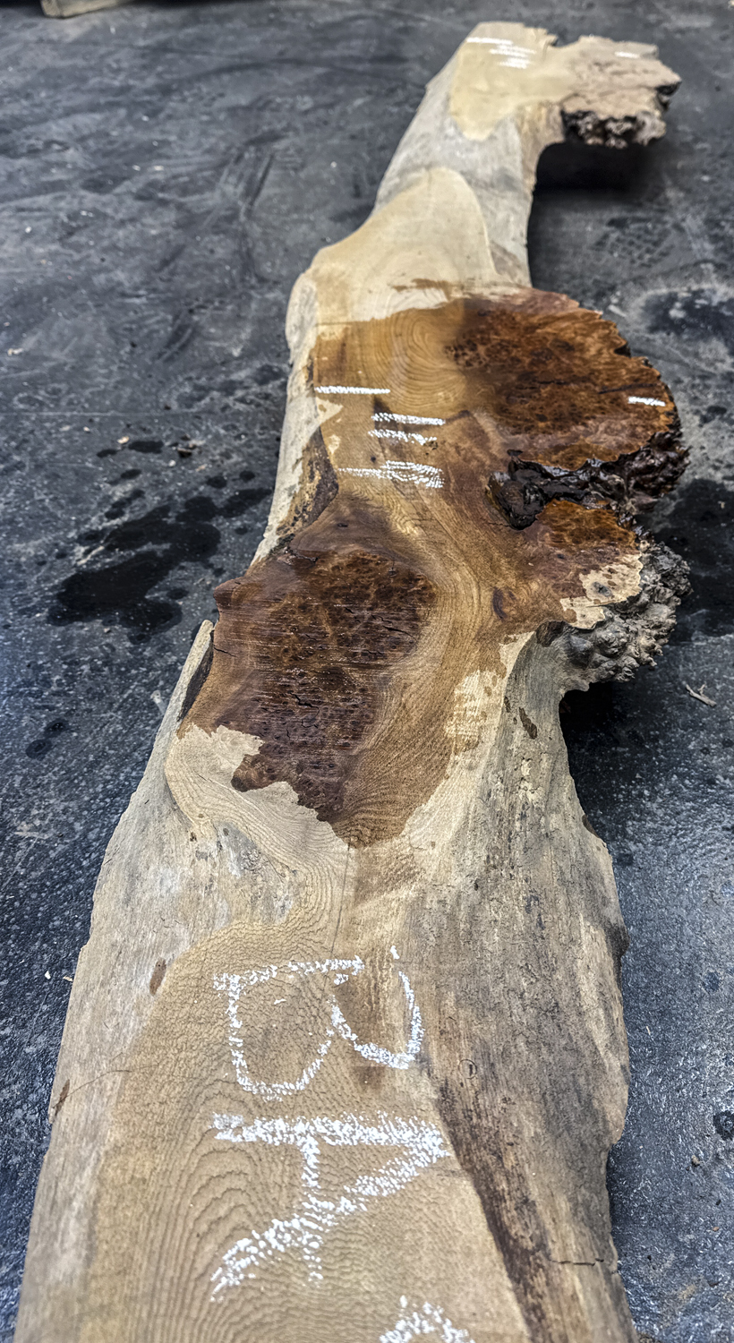 Outside cut slab with some burl pockets and a unique shape. Moderate bowing- needs broken in half lengthwise to flatten.