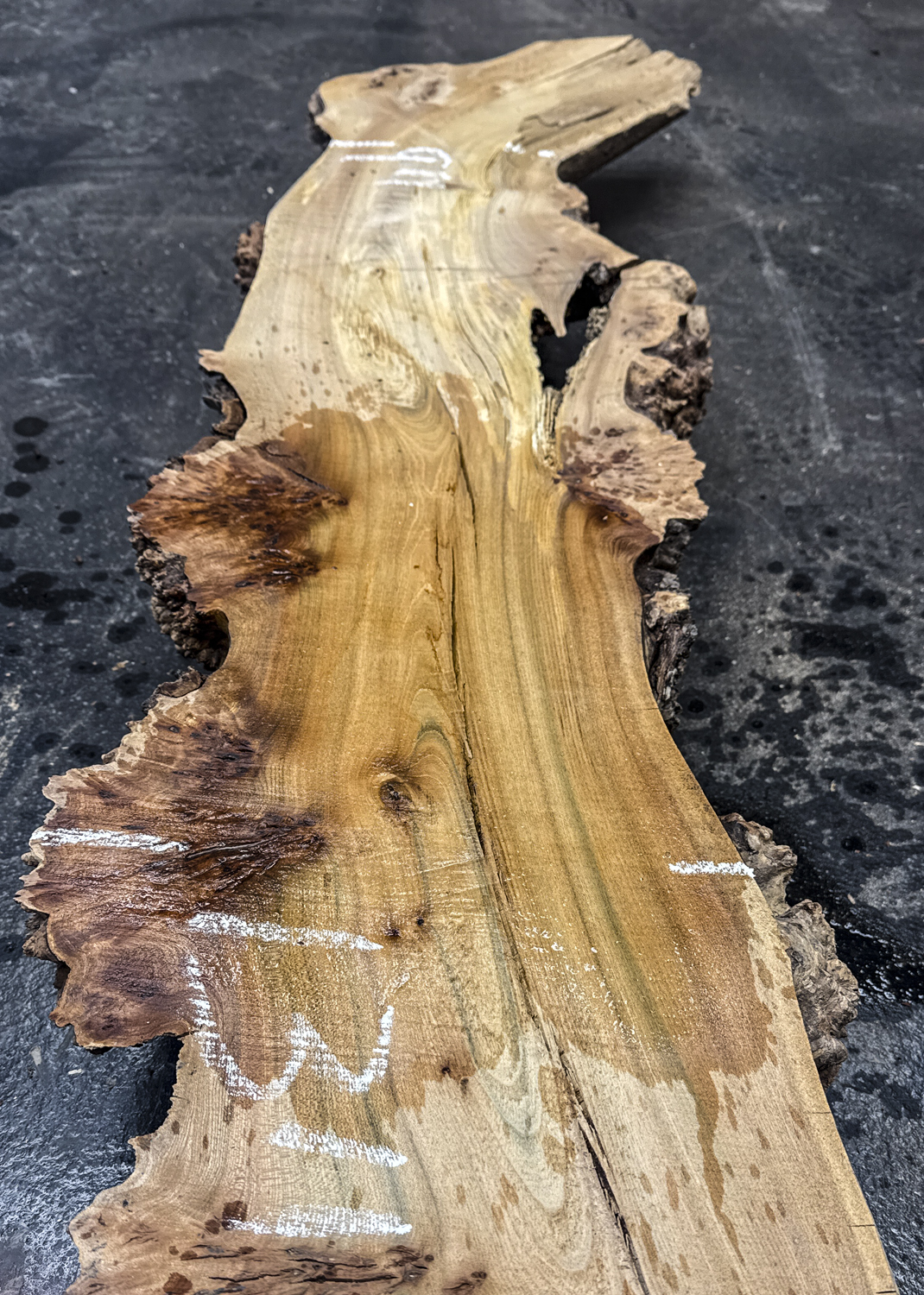 Interesting live edge slab with some burl pockets and a serpentine shape. Has some pith checking green streaks and rot at the top.