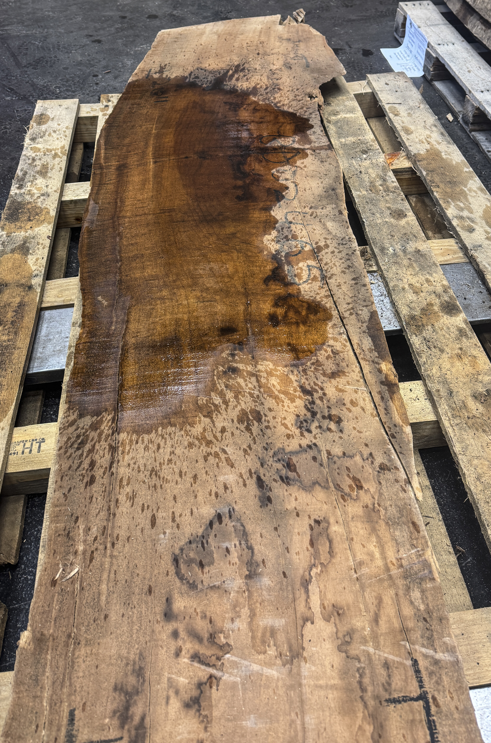 Outside cut slab with heavy curly figure at one end that fades away in the rest of the slab but deep checking and lots of sapwood on the back face. Lots of cupping- best broken down into billets.