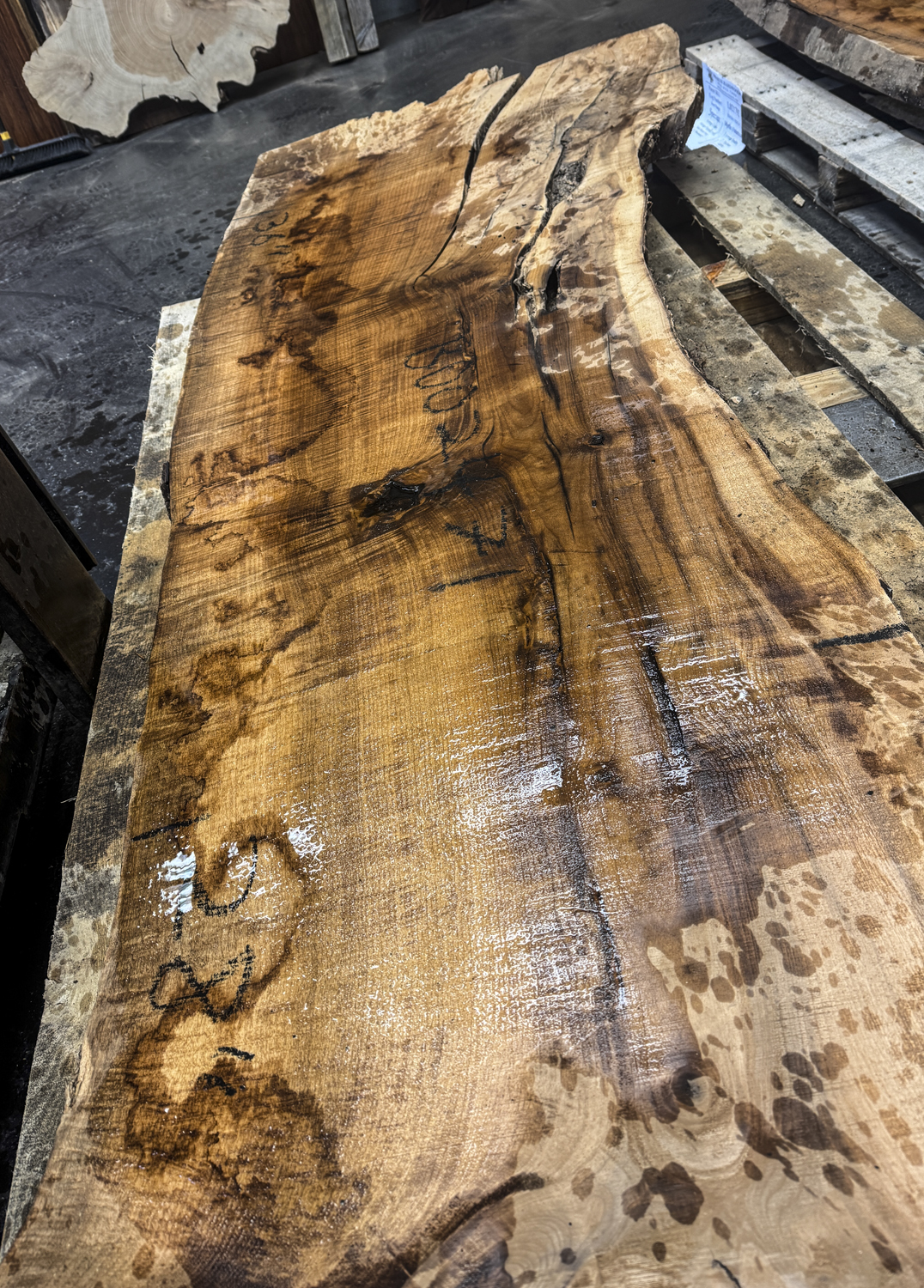 Interesting live edge slab with fantastic tight curly figure at the wide end and along one edge. It has some pith checking and knots that need filled throughout and light twist. It has some worm holes in the sap