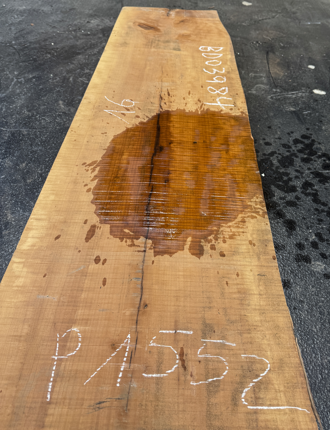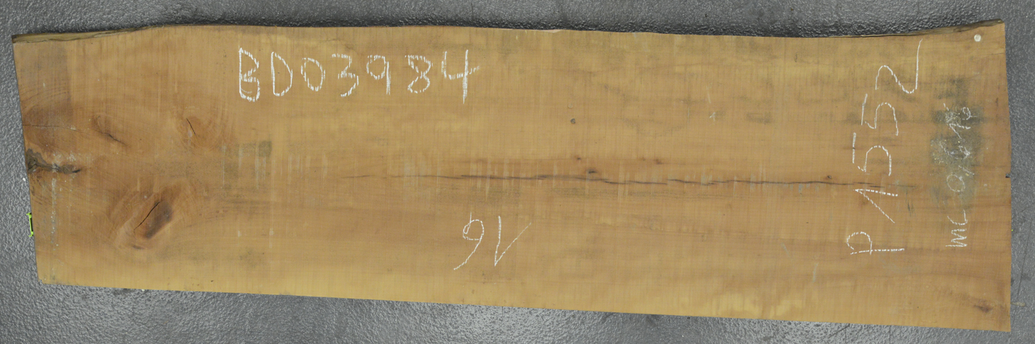 Excellent wide board couple knots at the top and very light pith checking on the back face but otherwise clear. Great even color some cupping.