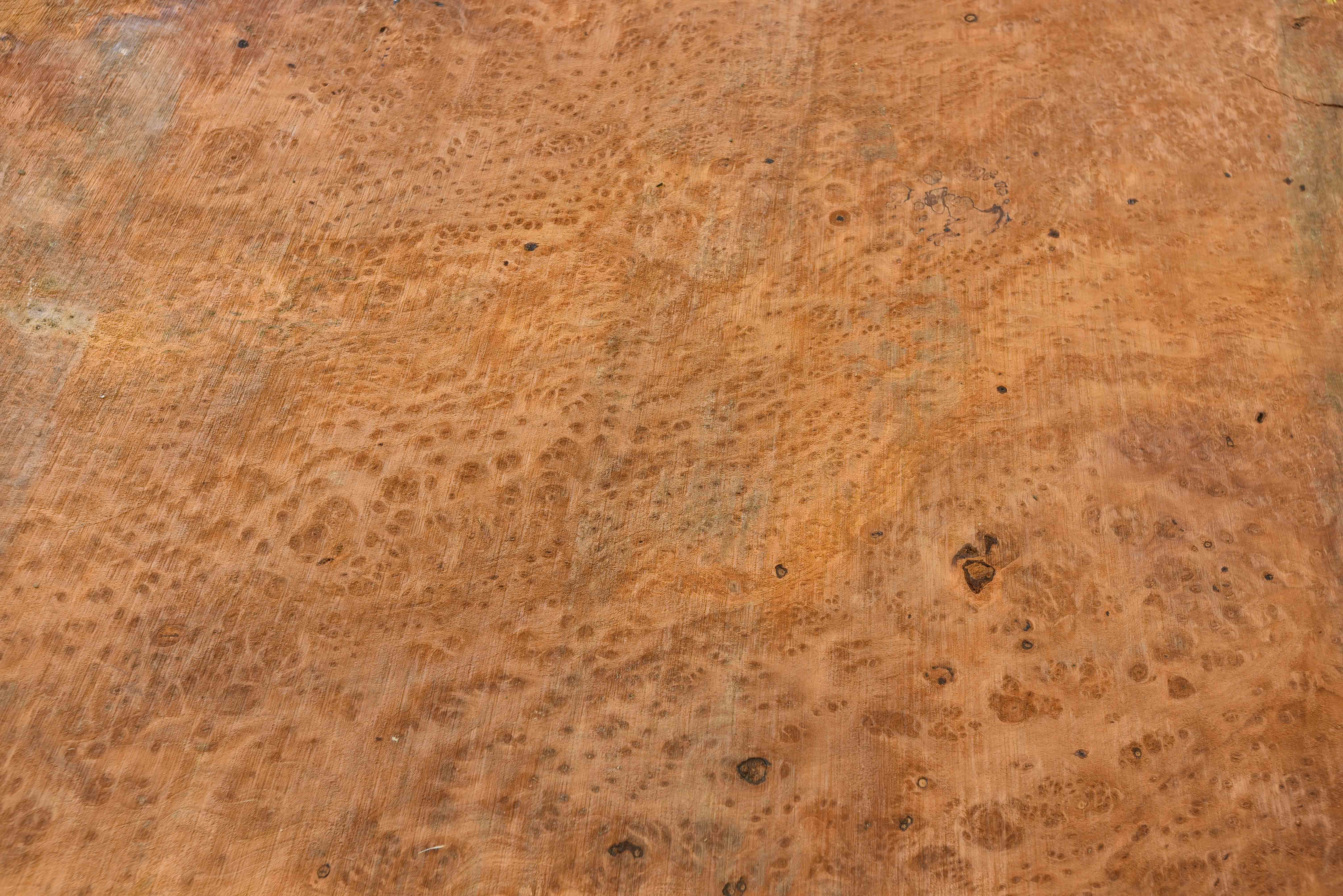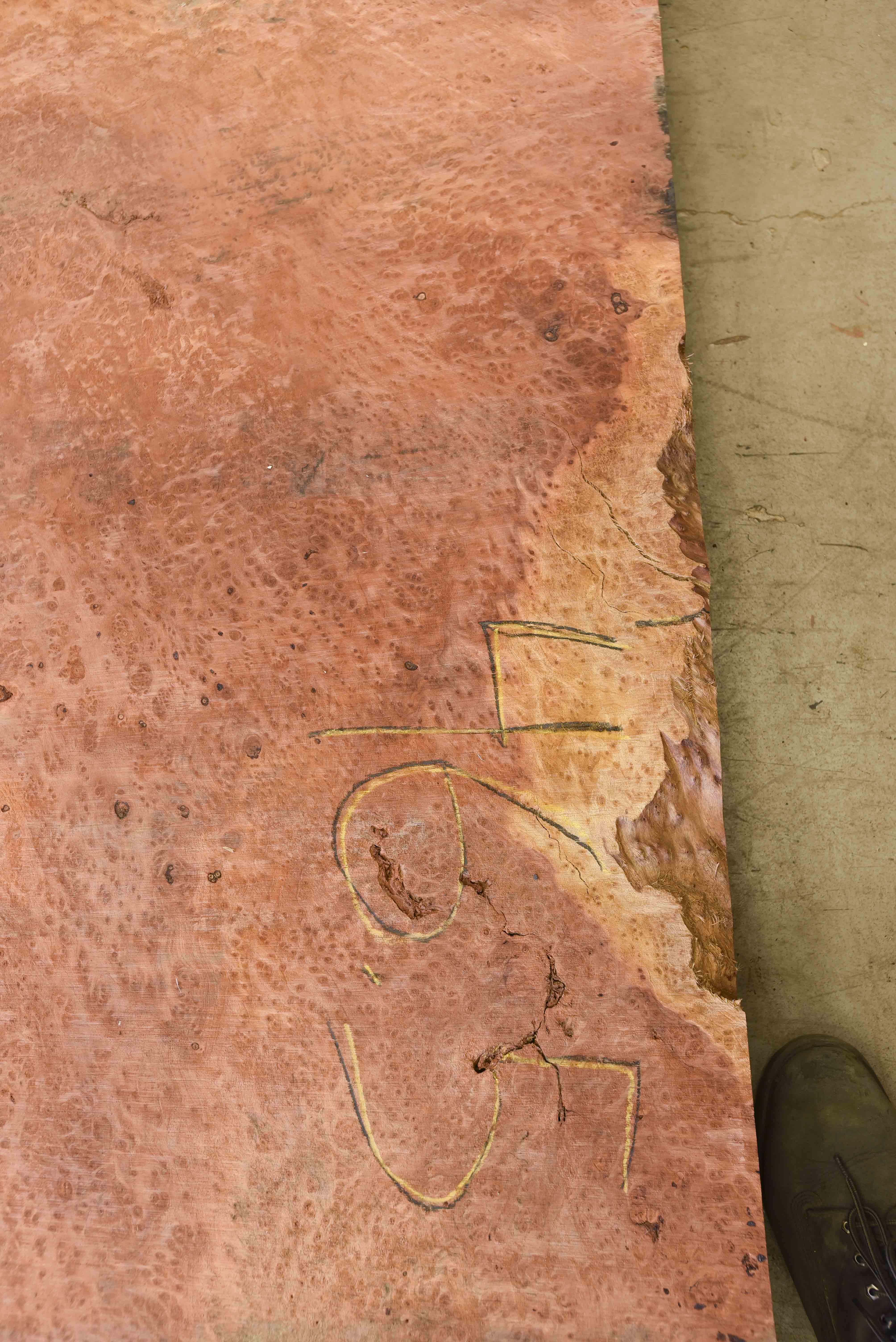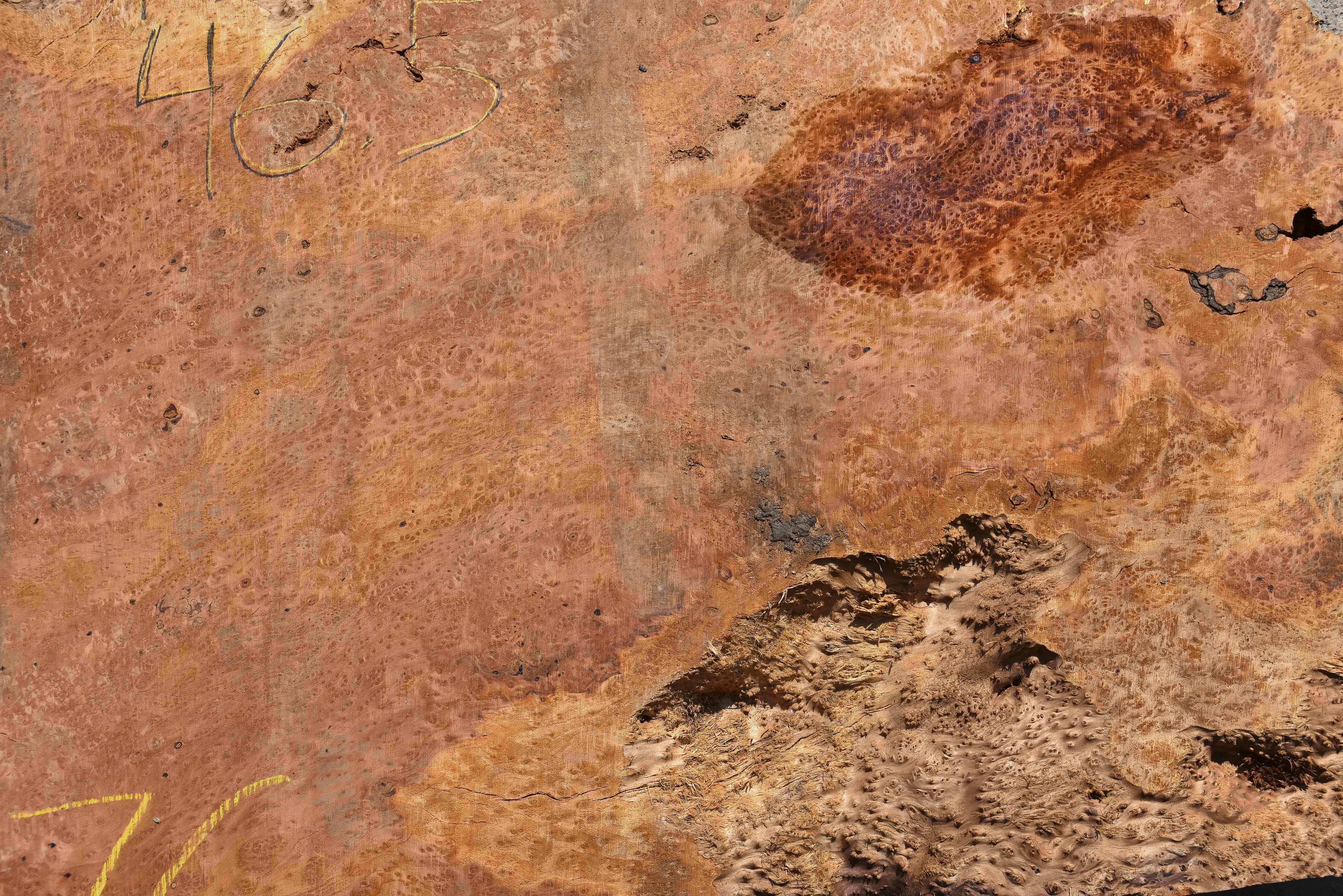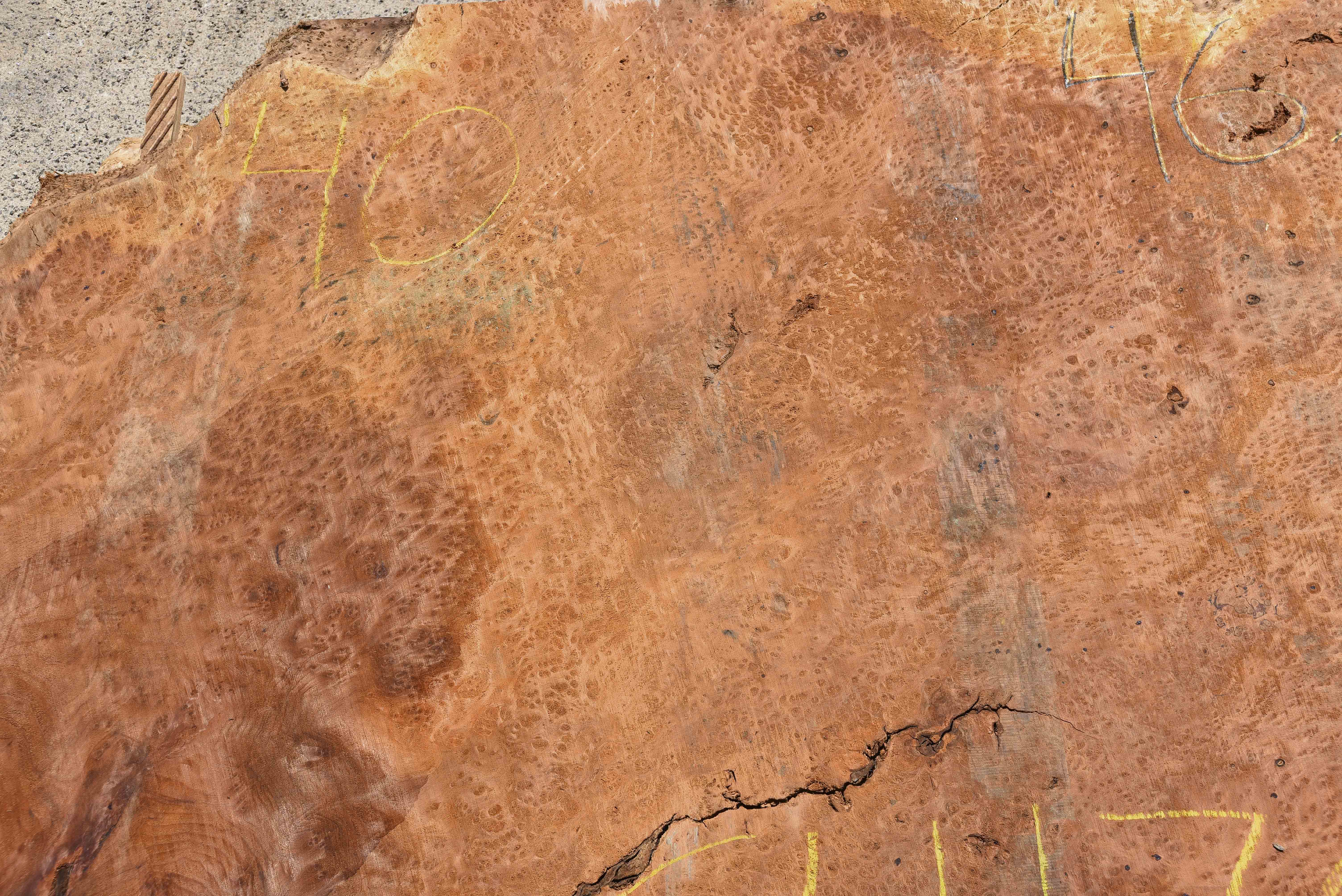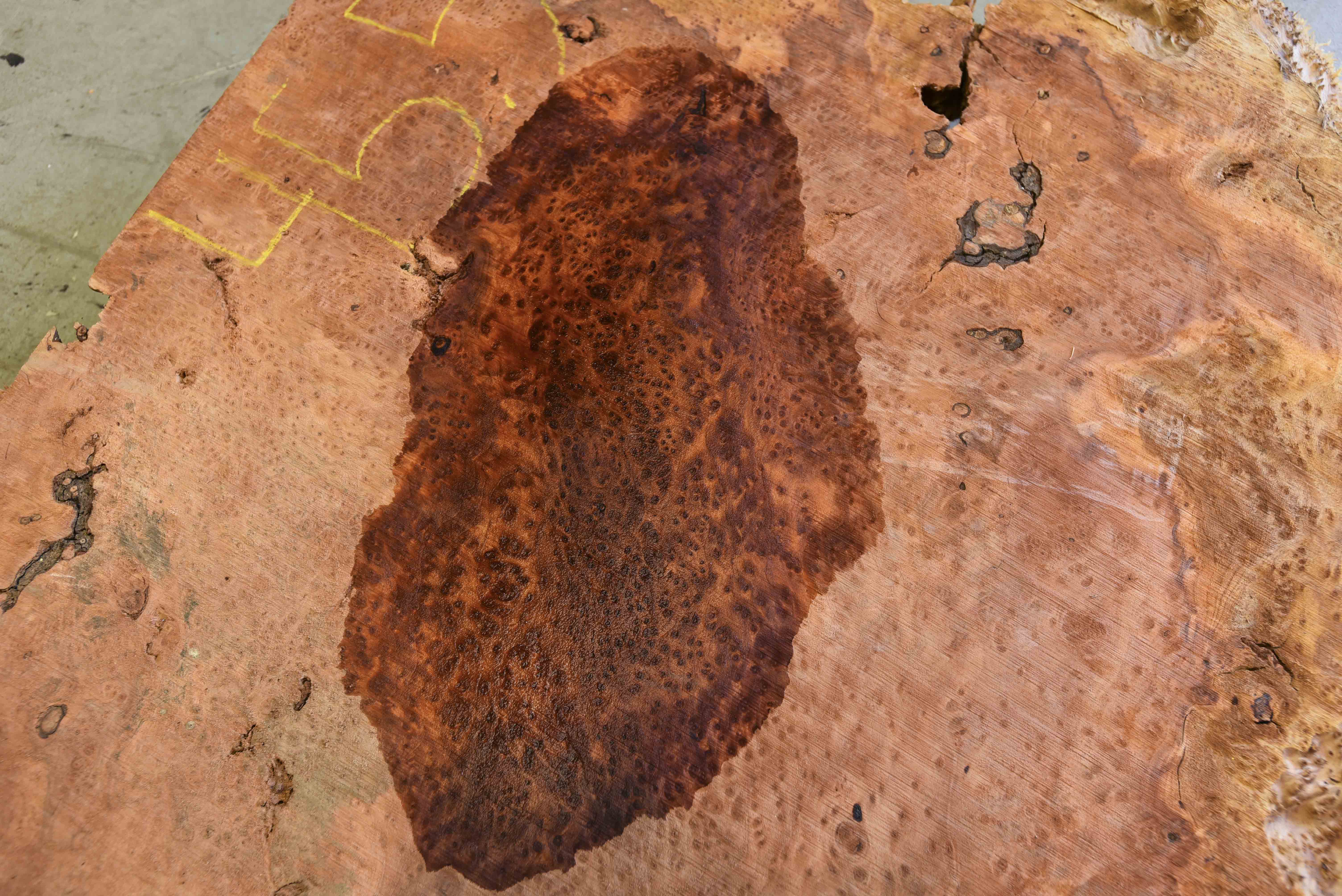 World-class Redwood burl – Heavy burl clusters throughout the entire slab! Two cut edges. Defects typical of burl: knots checks bark inclusion open voids. Very slight twist.