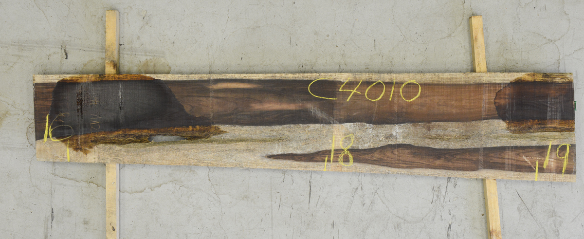 Outside cut unique slab. Very nice heart to sap contrast. Does show some bow.