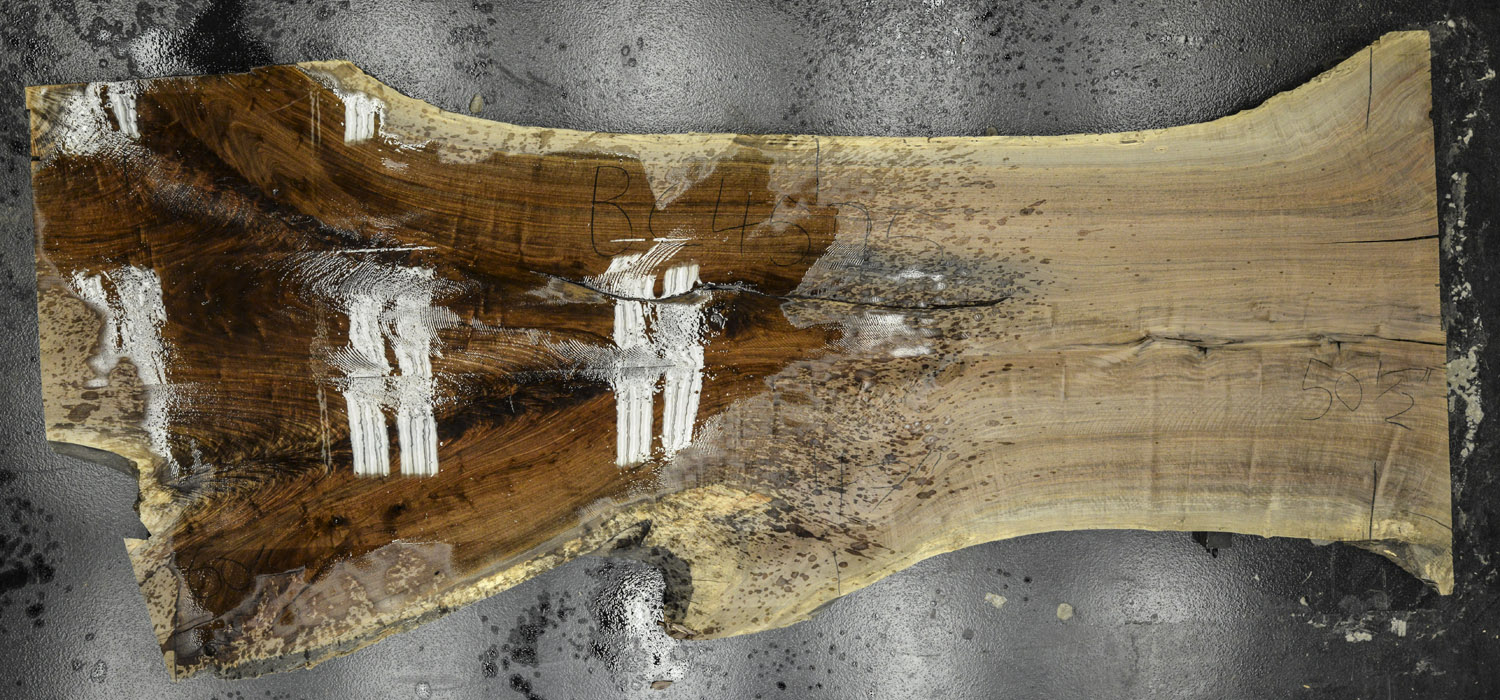 Excellent wide slab with great crotch figure and a little compression figure at the bottom. Has a large pith crack down the center and some metal stain.