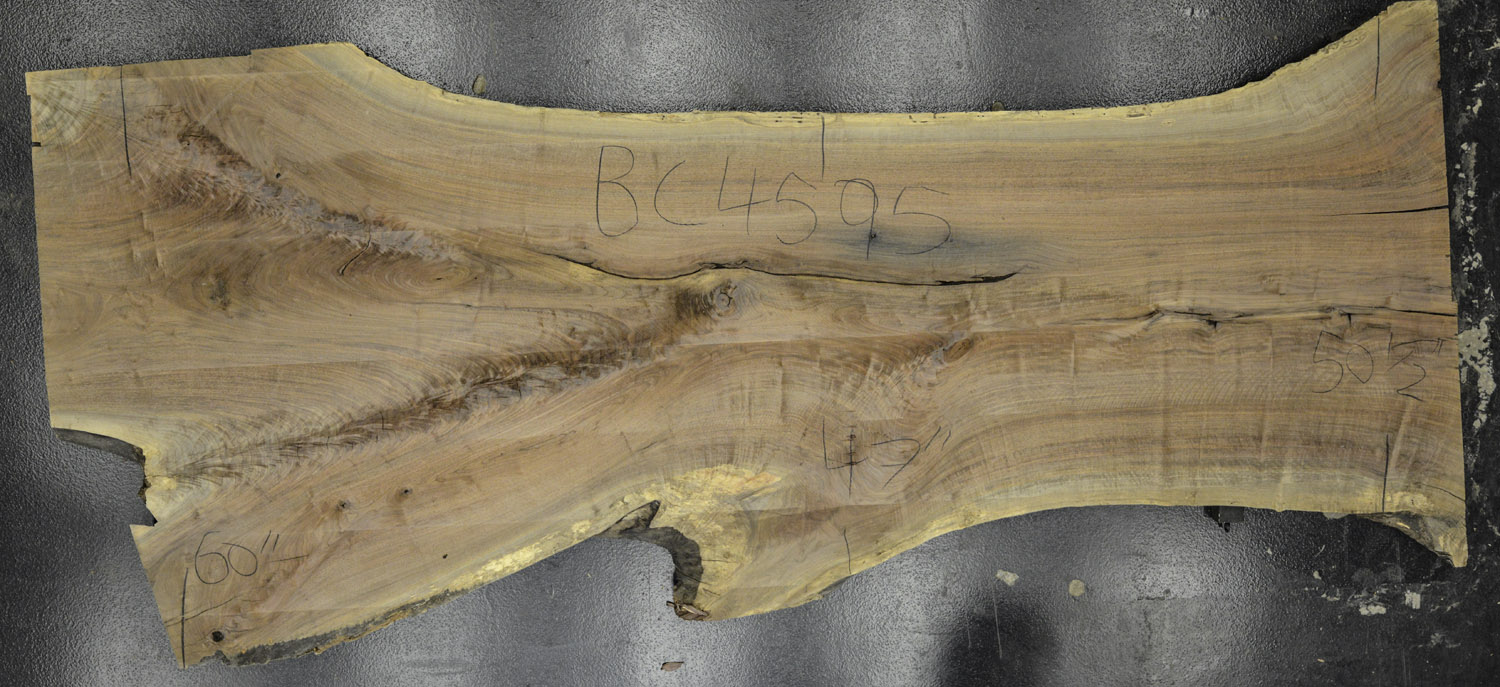 Excellent wide slab with great crotch figure and a little compression figure at the bottom. Has a large pith crack down the center and some metal stain.