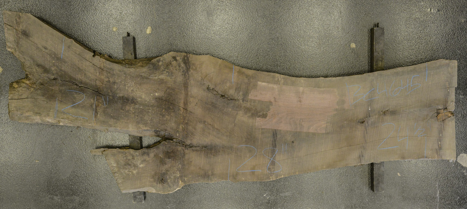 Nice live edge slab with a good dark color and great grain. Slab does have defects end and surface checking bark inclusions worm holes on the edges and some rot on the one end and edge.