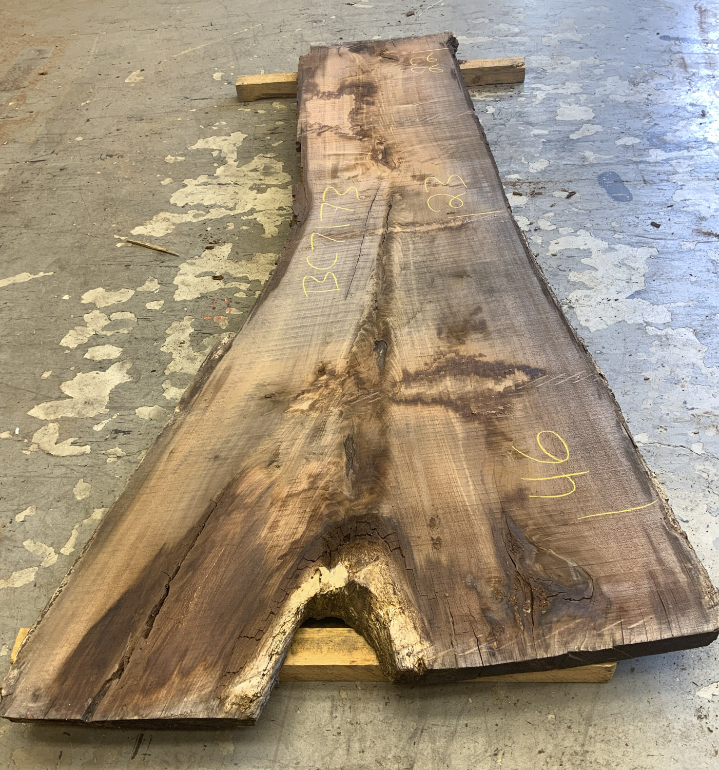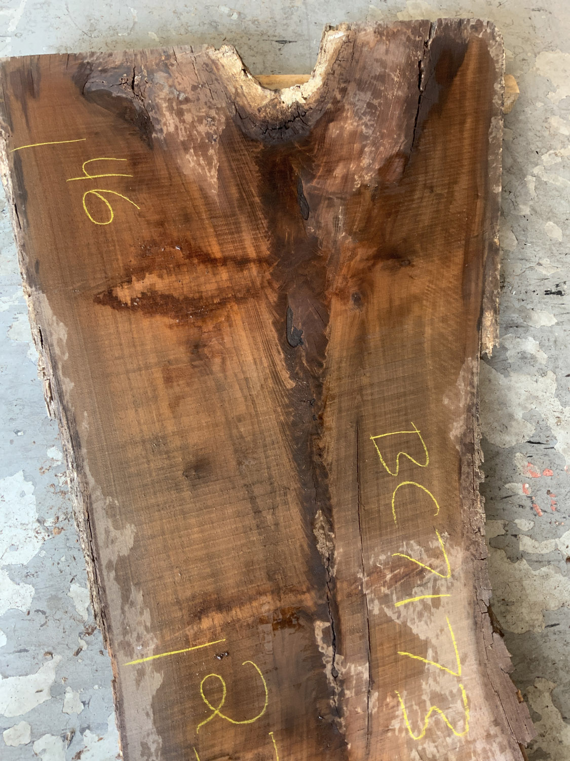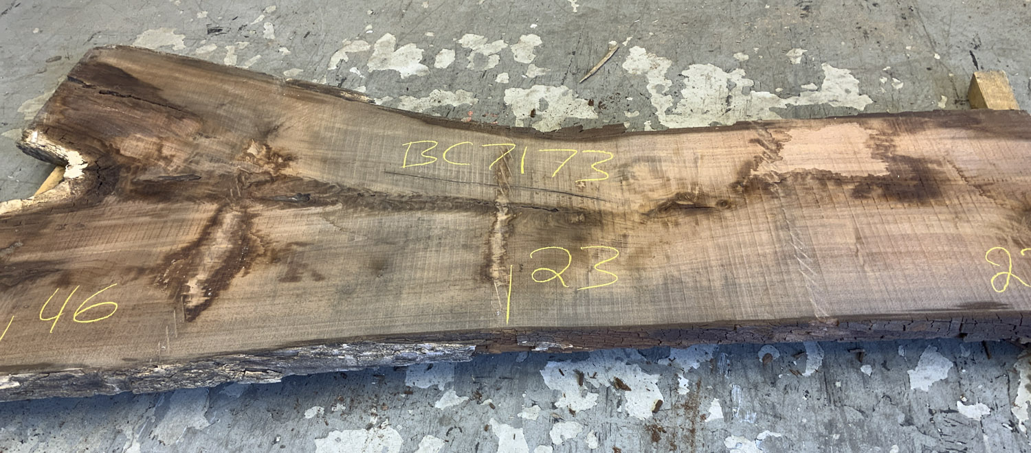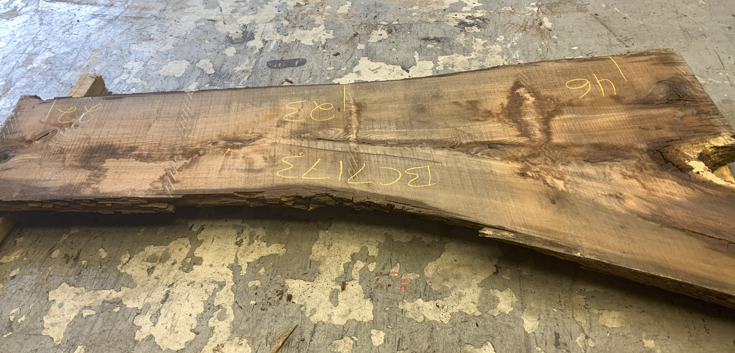 A great board for rustic projects. Shows crotch figure and light curl along the outside edge of the branch. Will need a little love but the bones are there – Defects include: cupping some checking knots and large sections of the sapwood and live edge are rotted or missing.