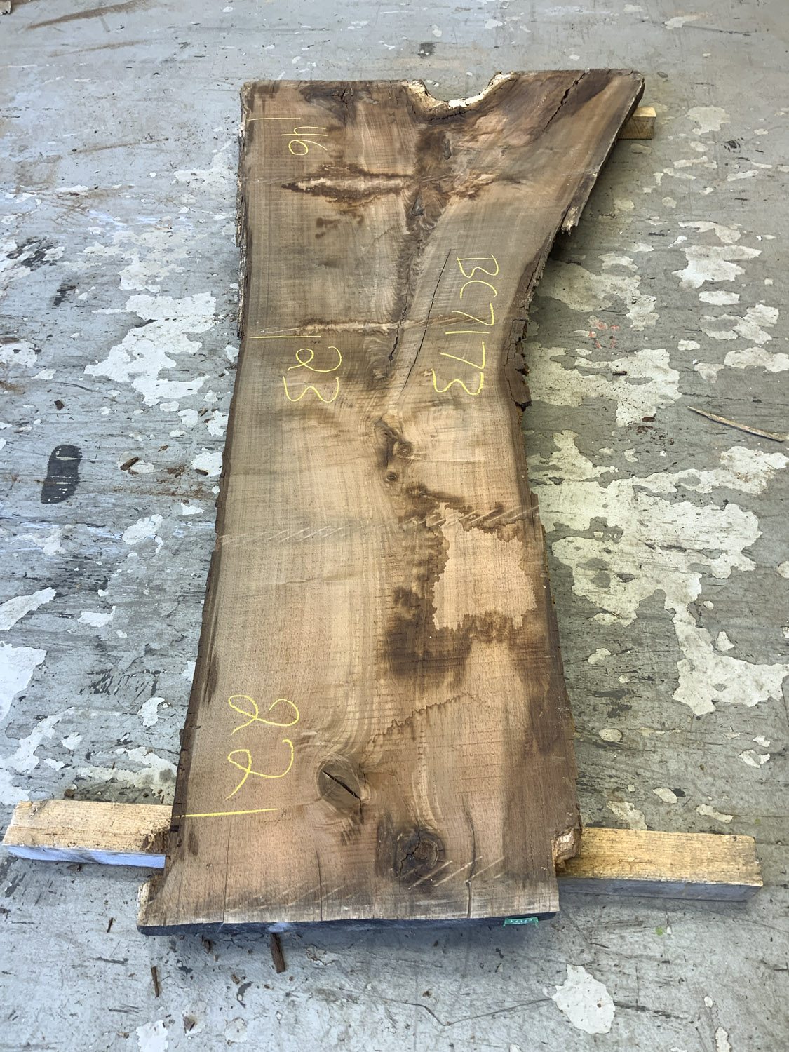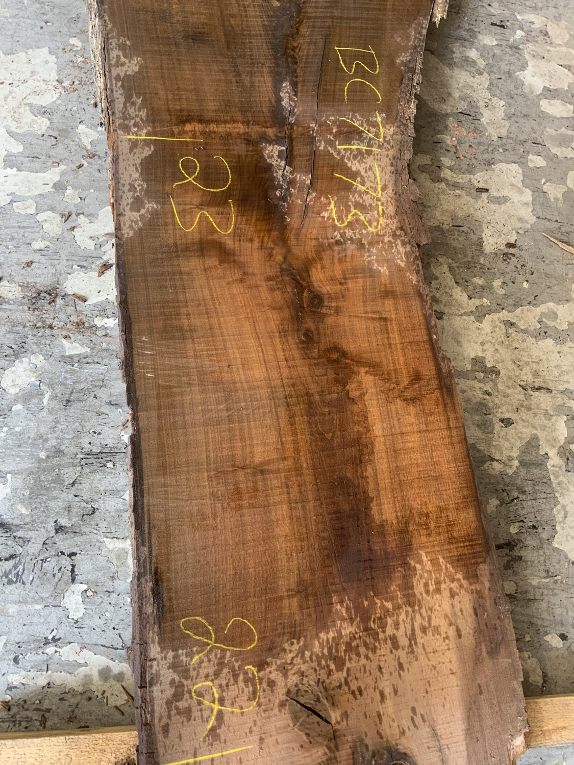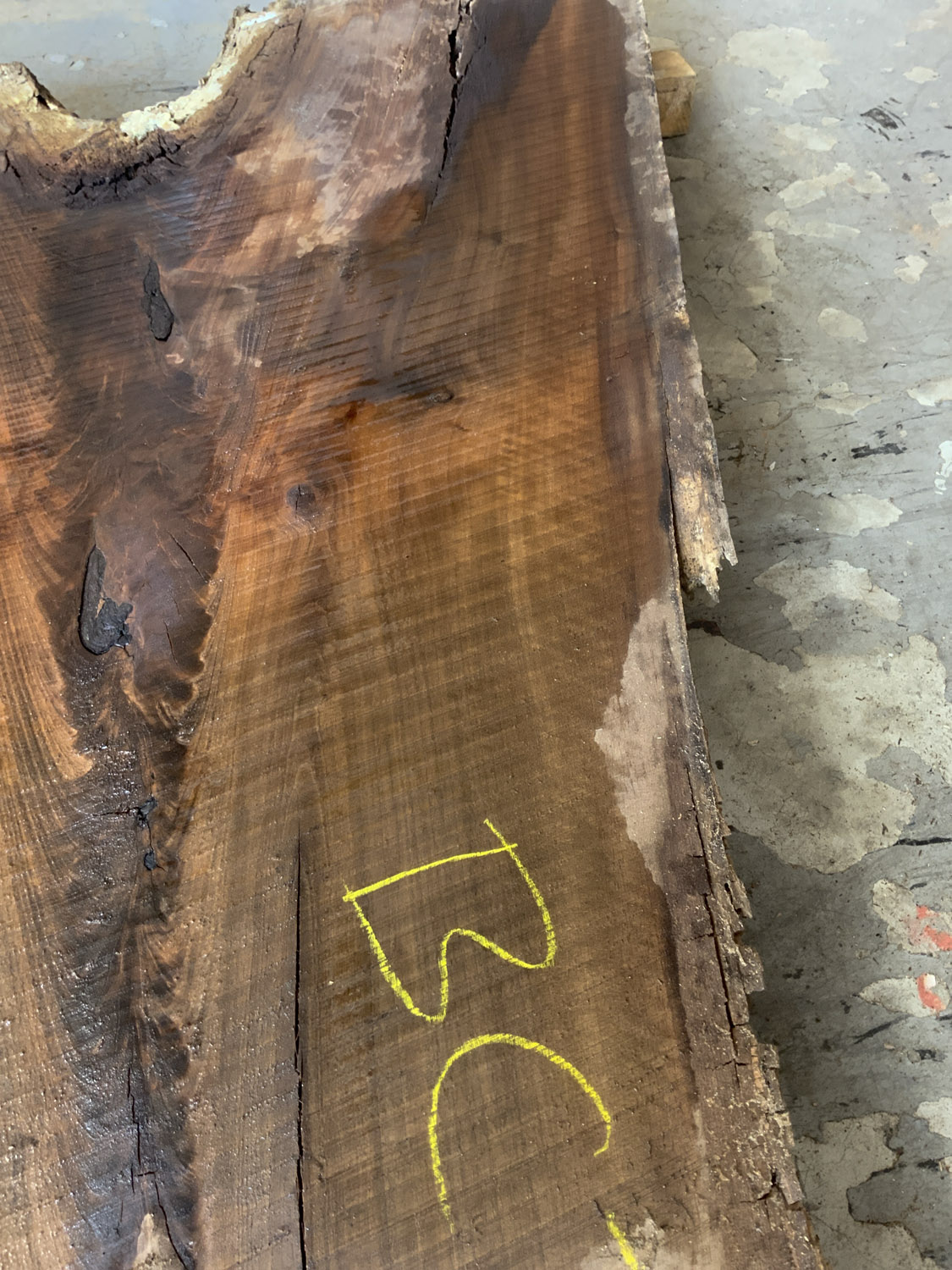 A great board for rustic projects. Shows crotch figure and light curl along the outside edge of the branch. Will need a little love but the bones are there – Defects include: cupping some checking knots and large sections of the sapwood and live edge are rotted or missing.