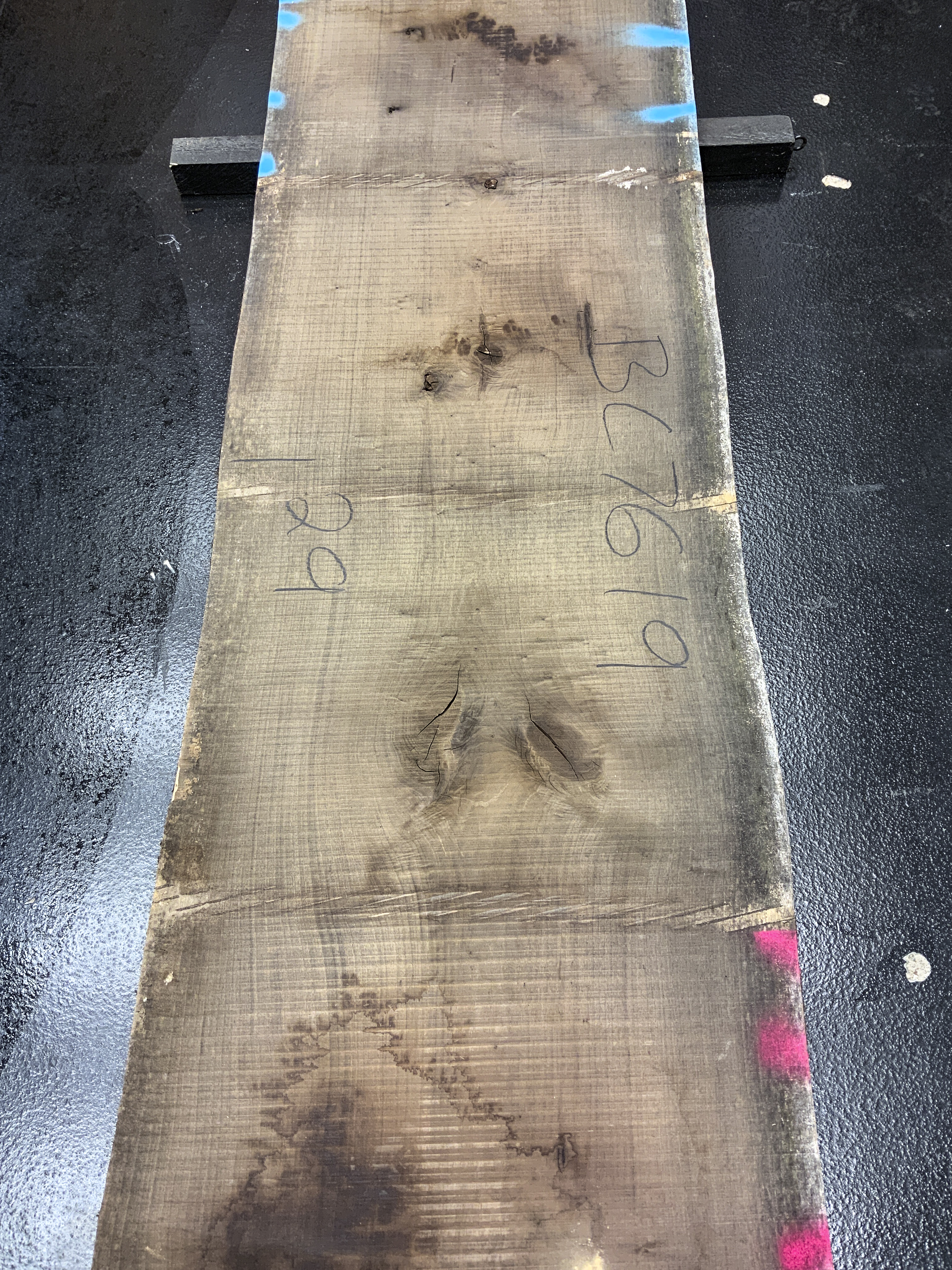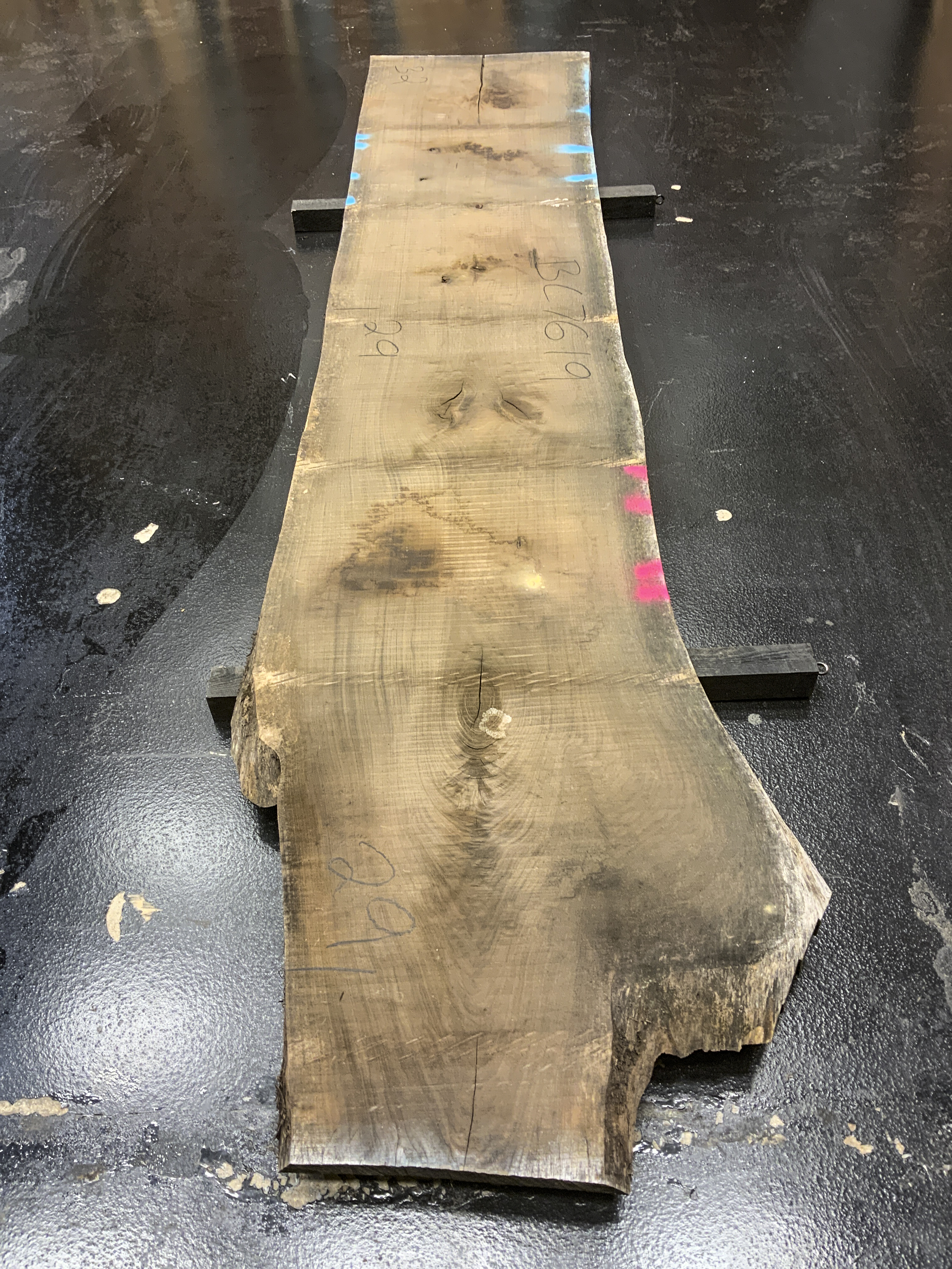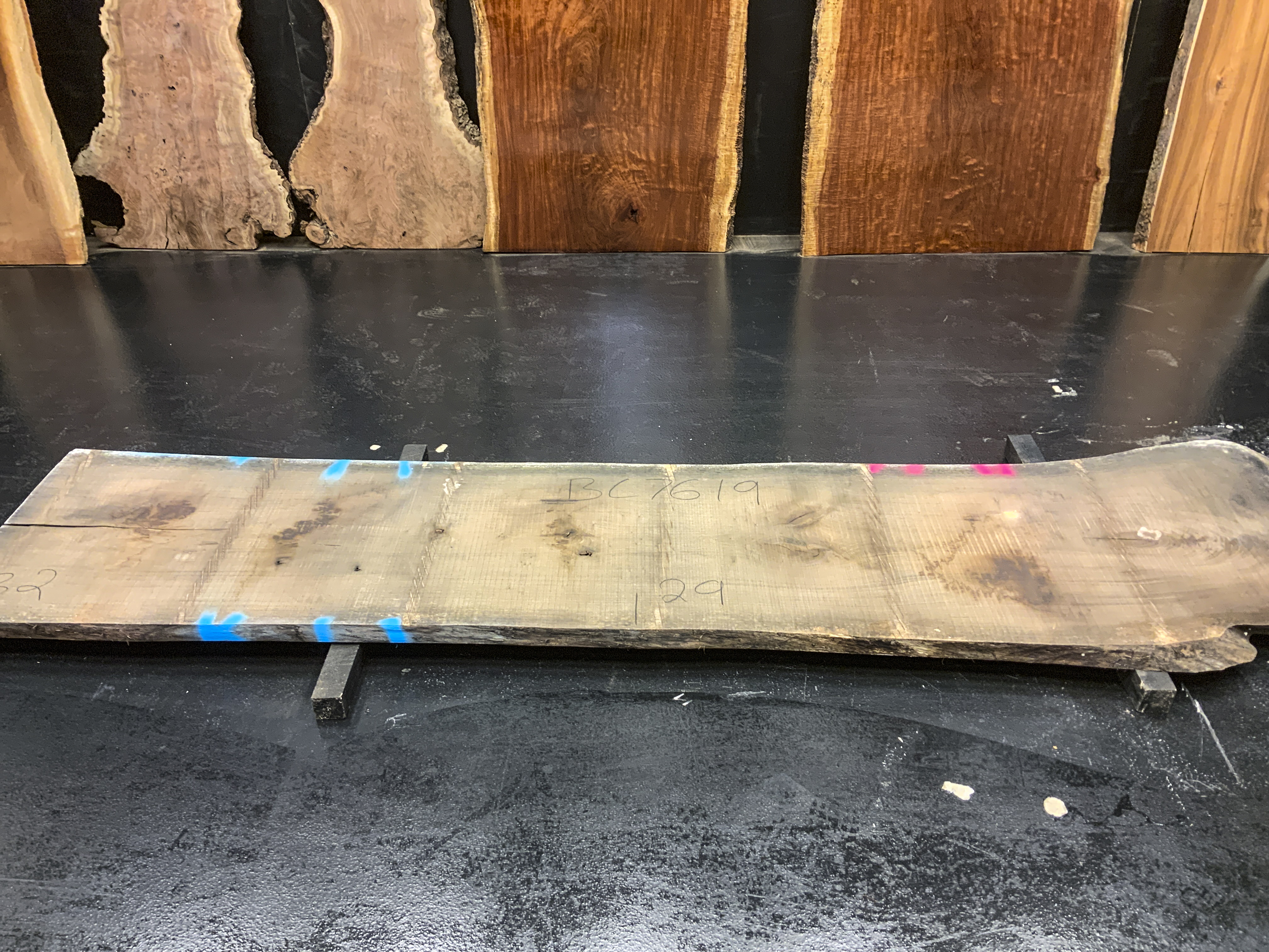 Long Black Walnut slab. Perfect for a bar top/countertop. Minimal defects: End checking and large knots. Has some light curl and crotch figure.