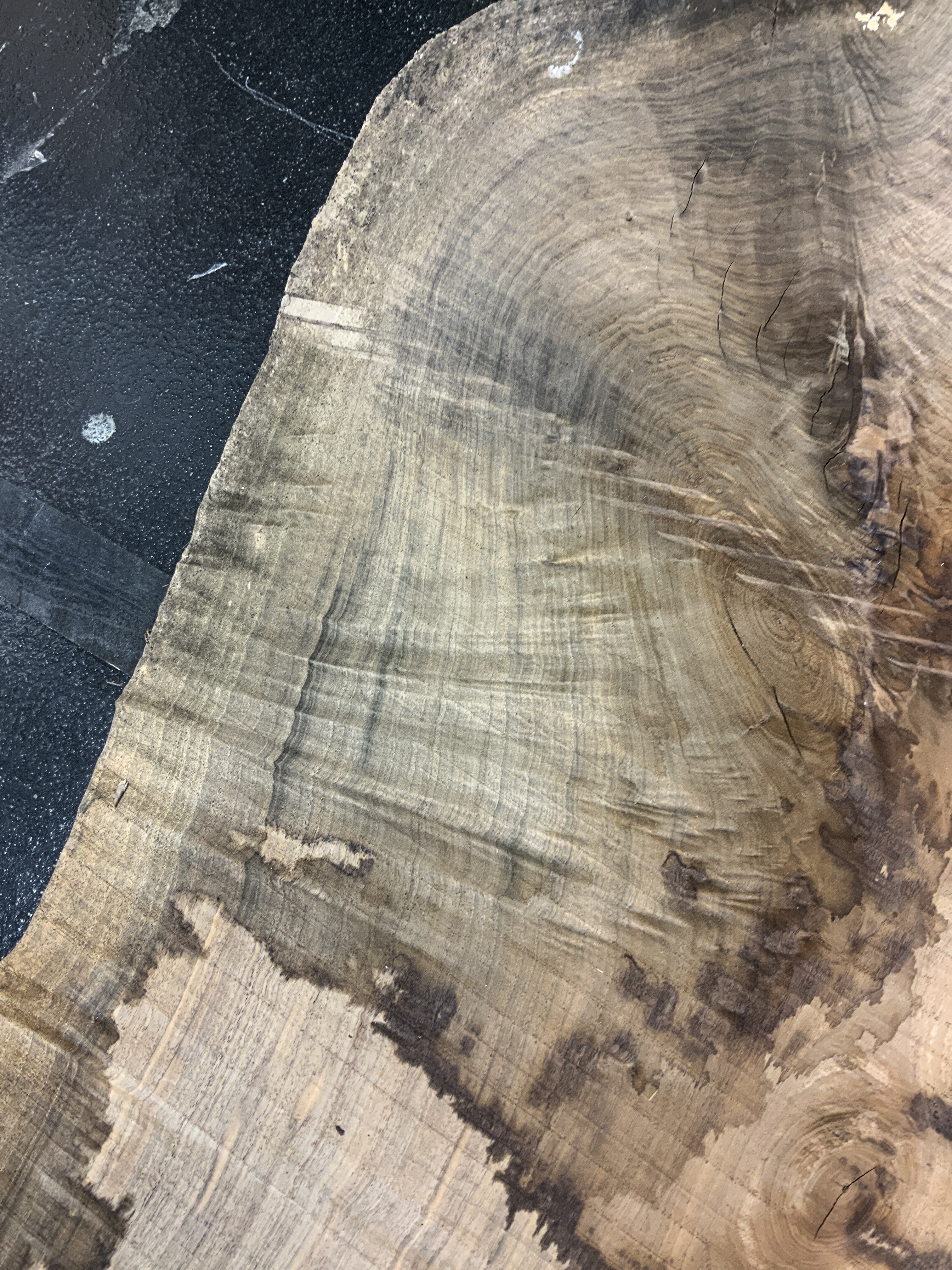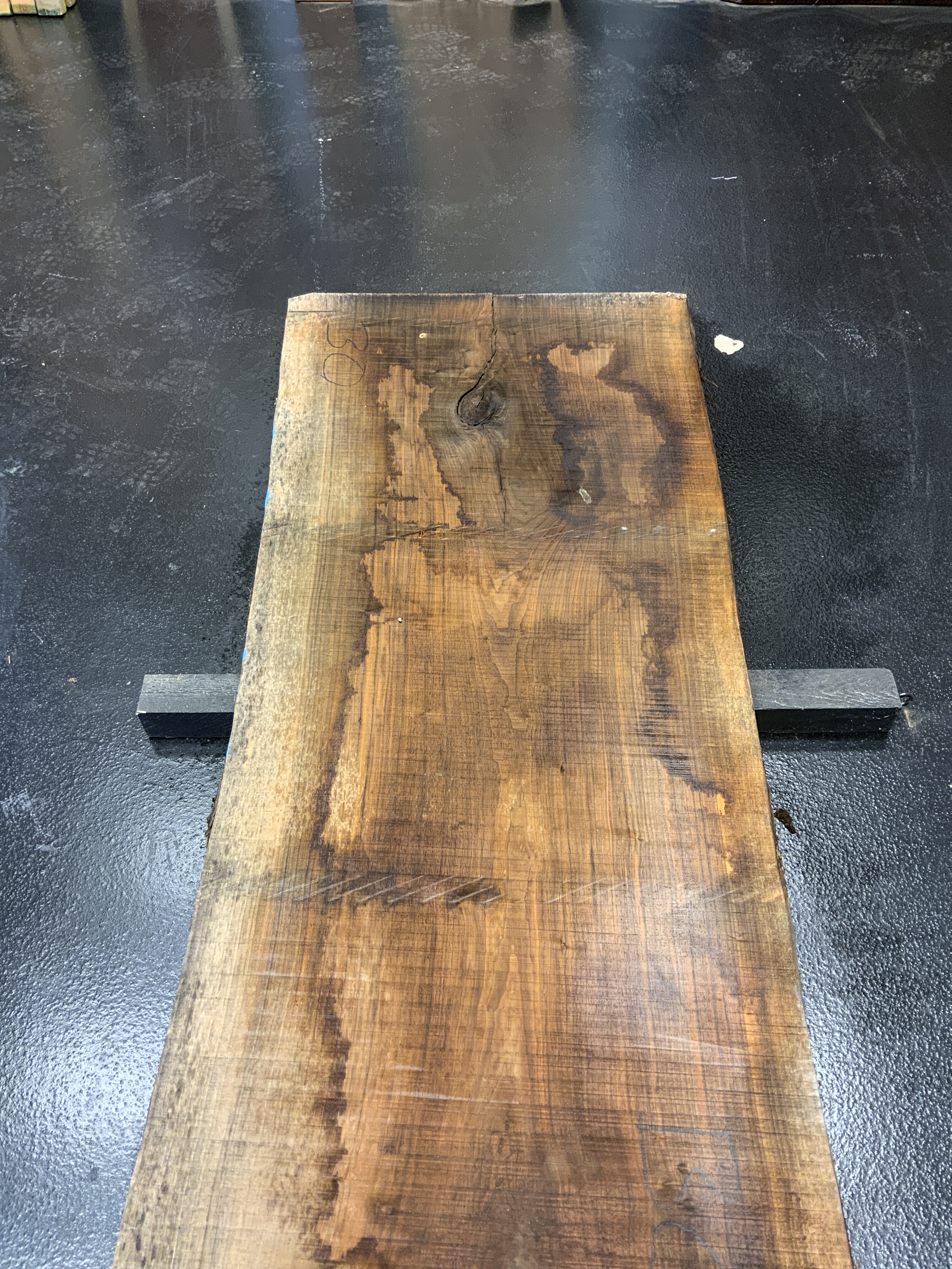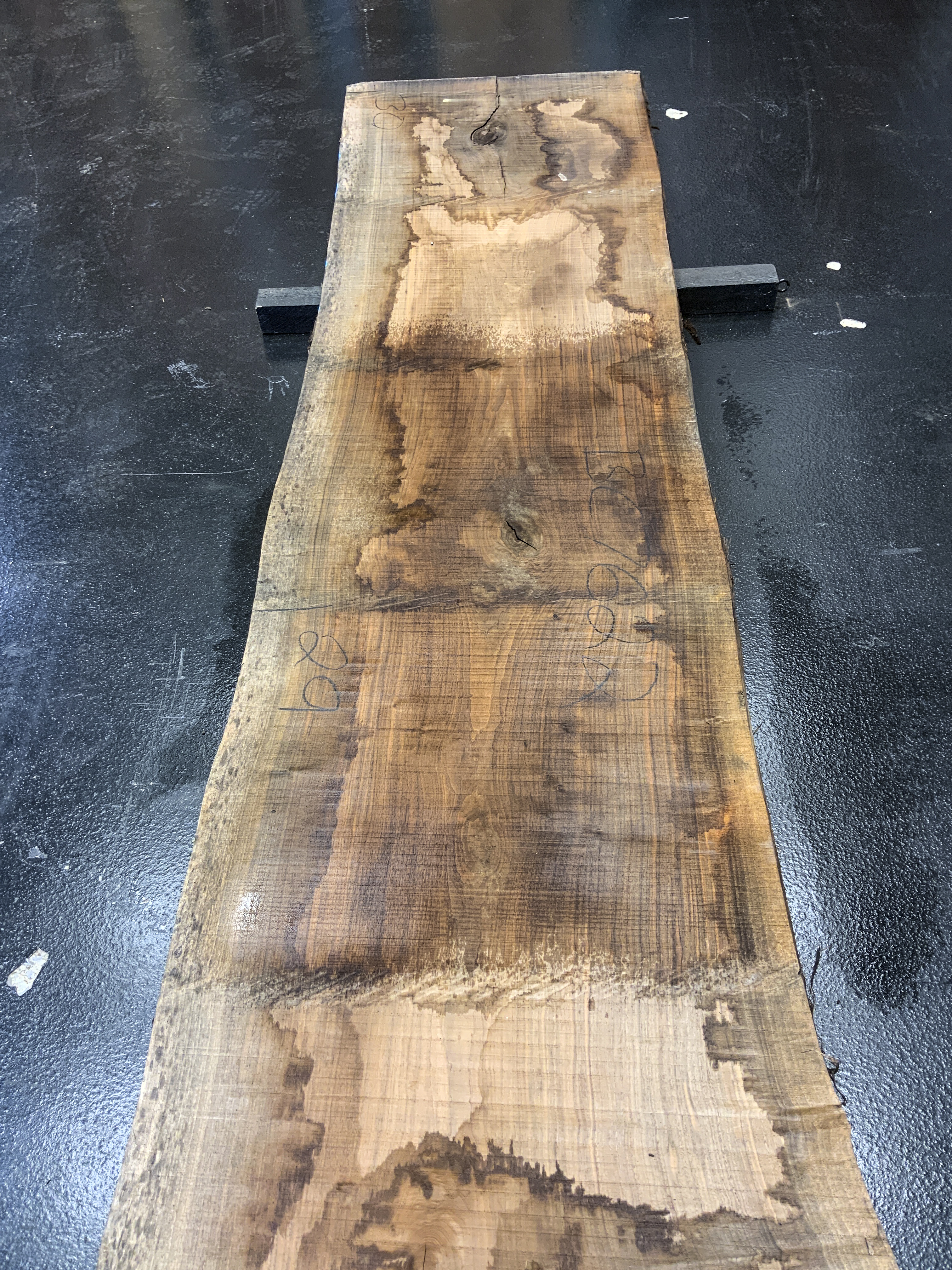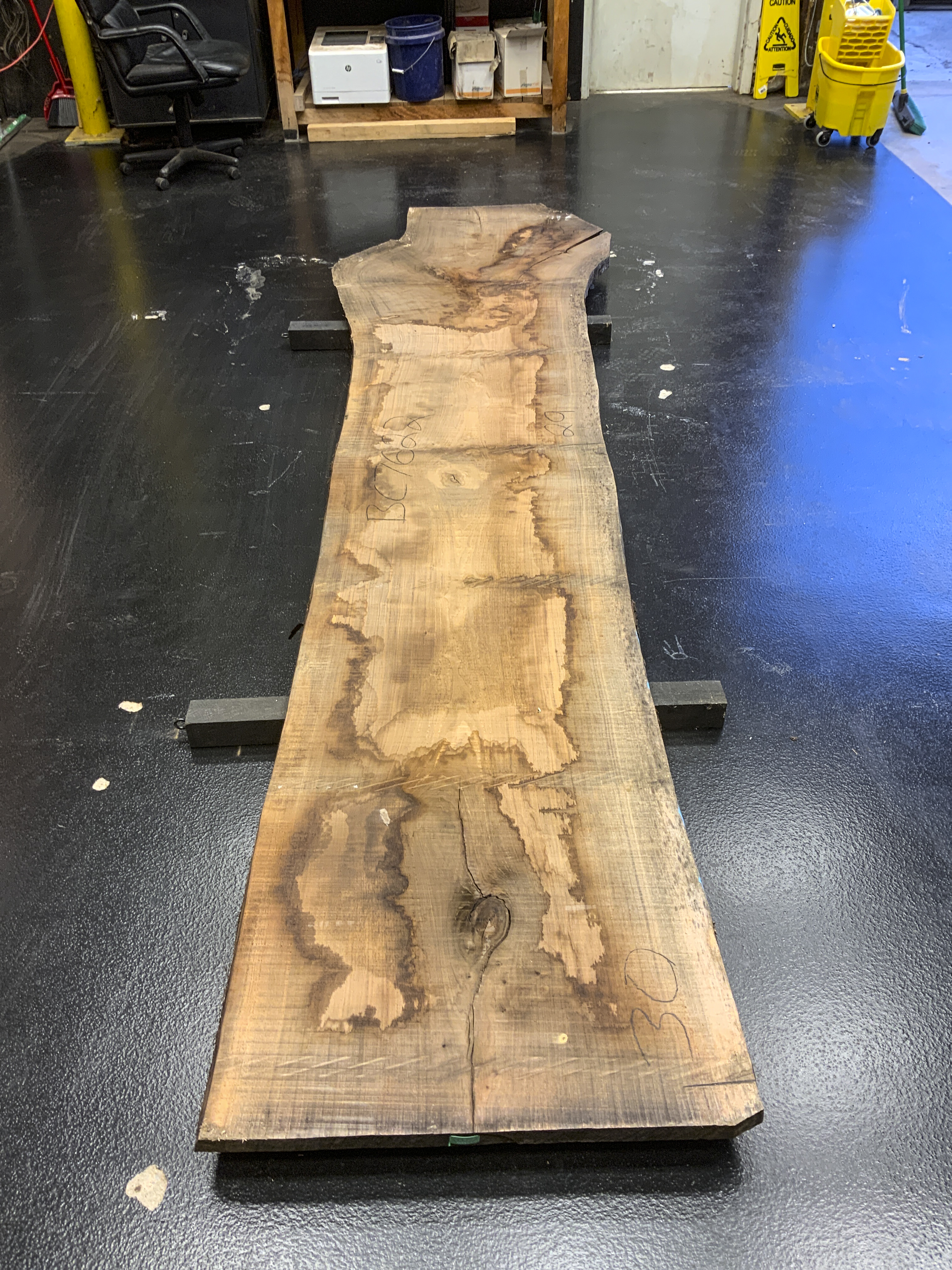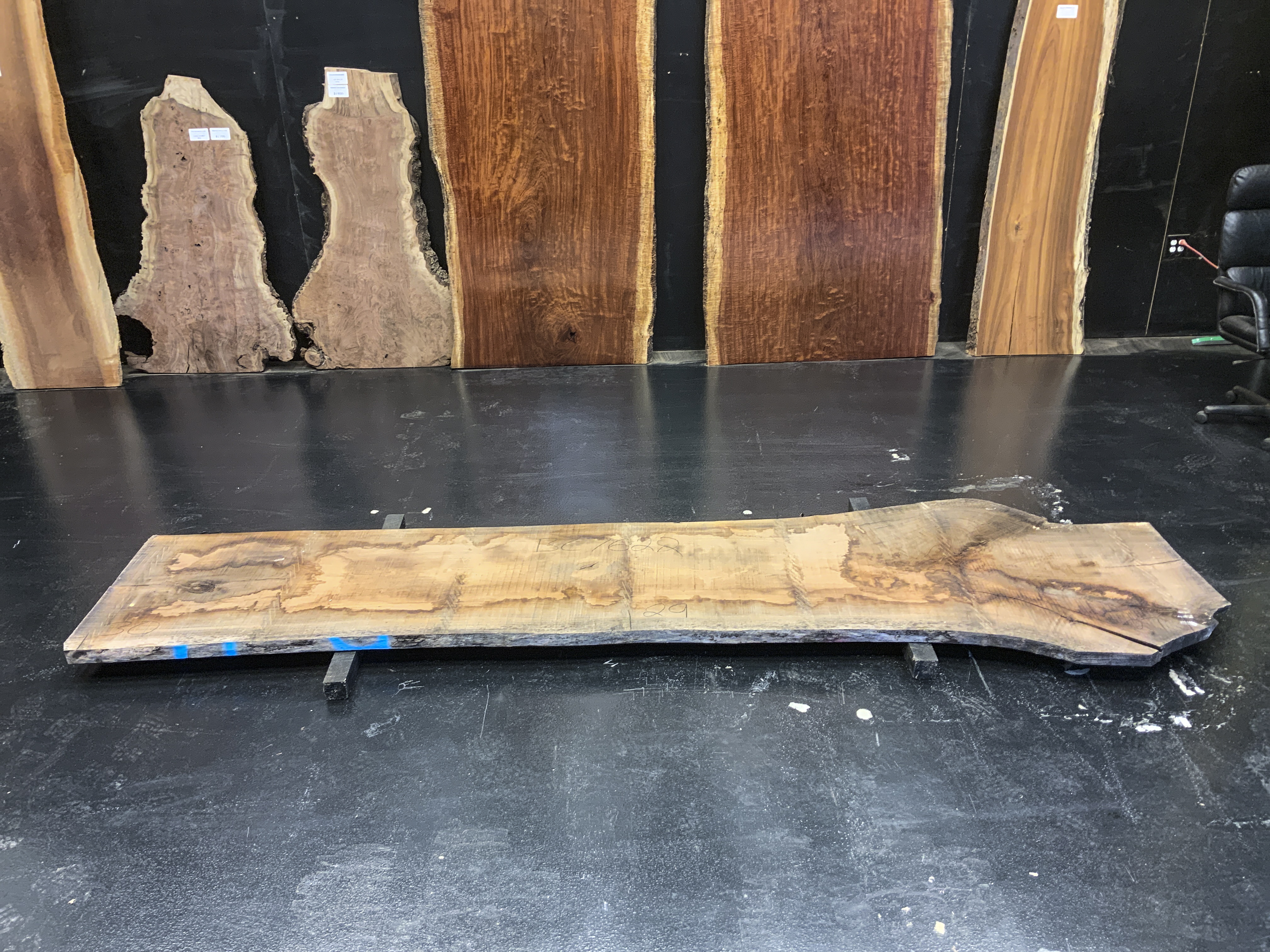 Long Black Walnut slab. Perfect for a bar top/countertop. Minimal defects: End checking and large knots. Has some light curl and crotch figure.