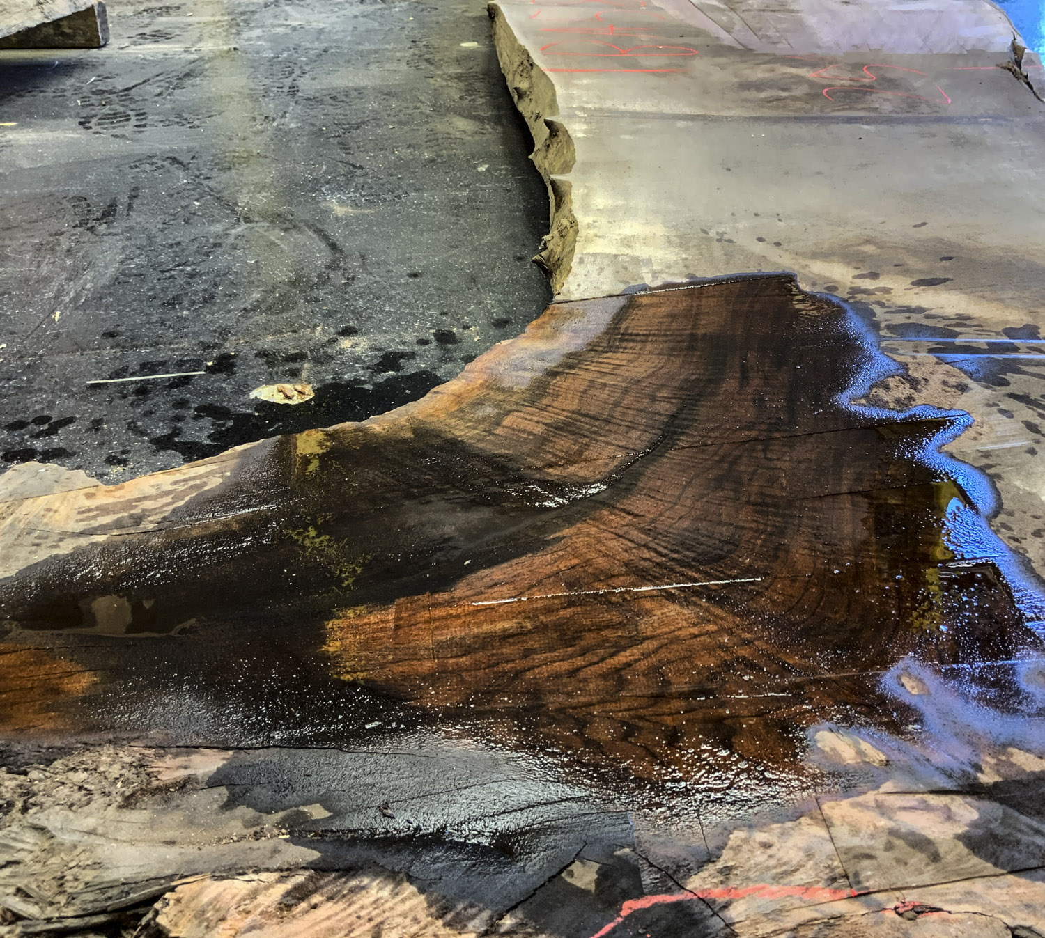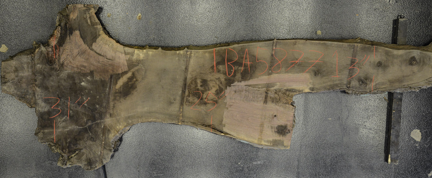 Unique live edge slab with an unusual shape some crotch figure in the middle and a flared top with curly compression figure. It has some worm holes (mostly in the sap) some surface checking and some cupping at the top.