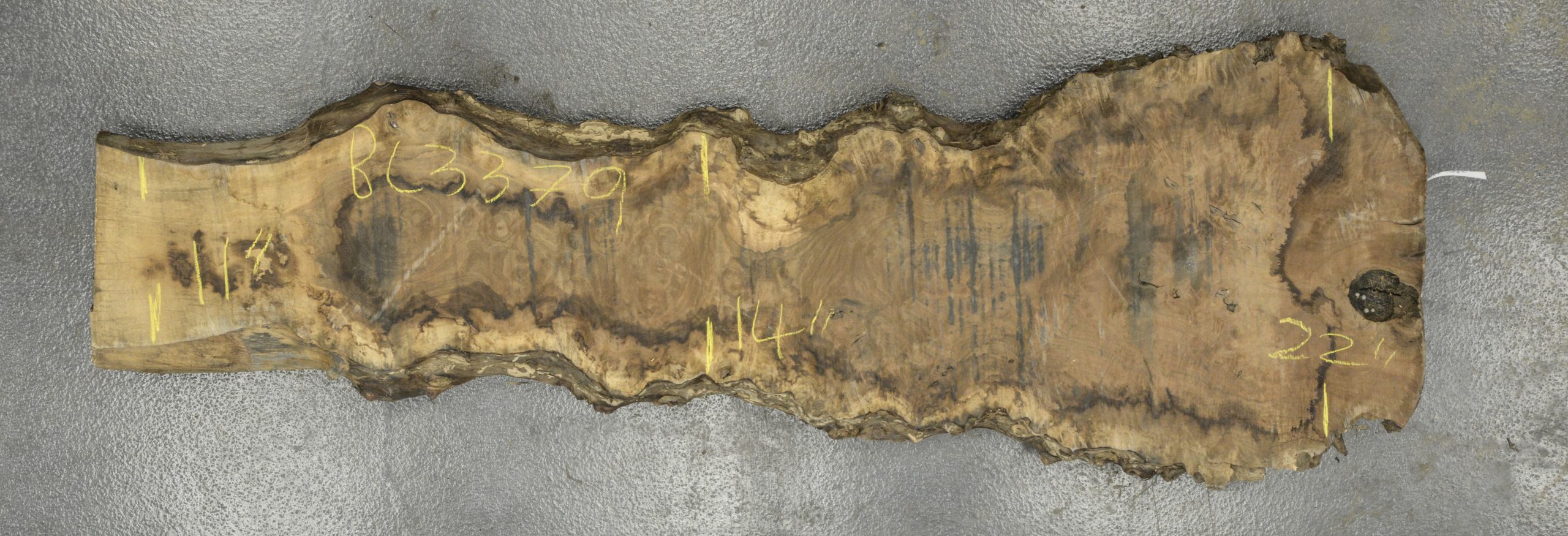 This slab has an interesting shape with heavy curly figure at the butt end and burl figure throughout. It has spiky growths on the live edges some bark inclusions and loads of worm holes in the sapwood with lots of sapwood at the narrow end. Light twist.