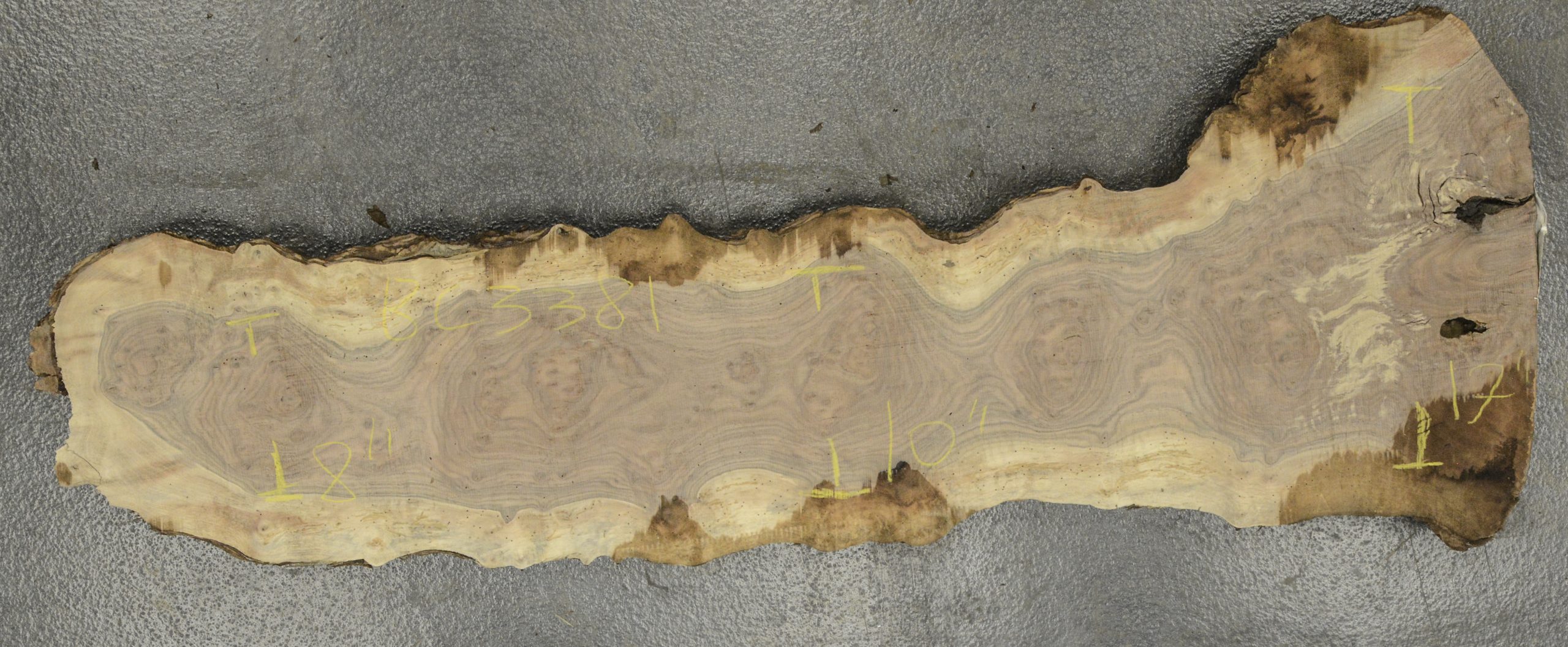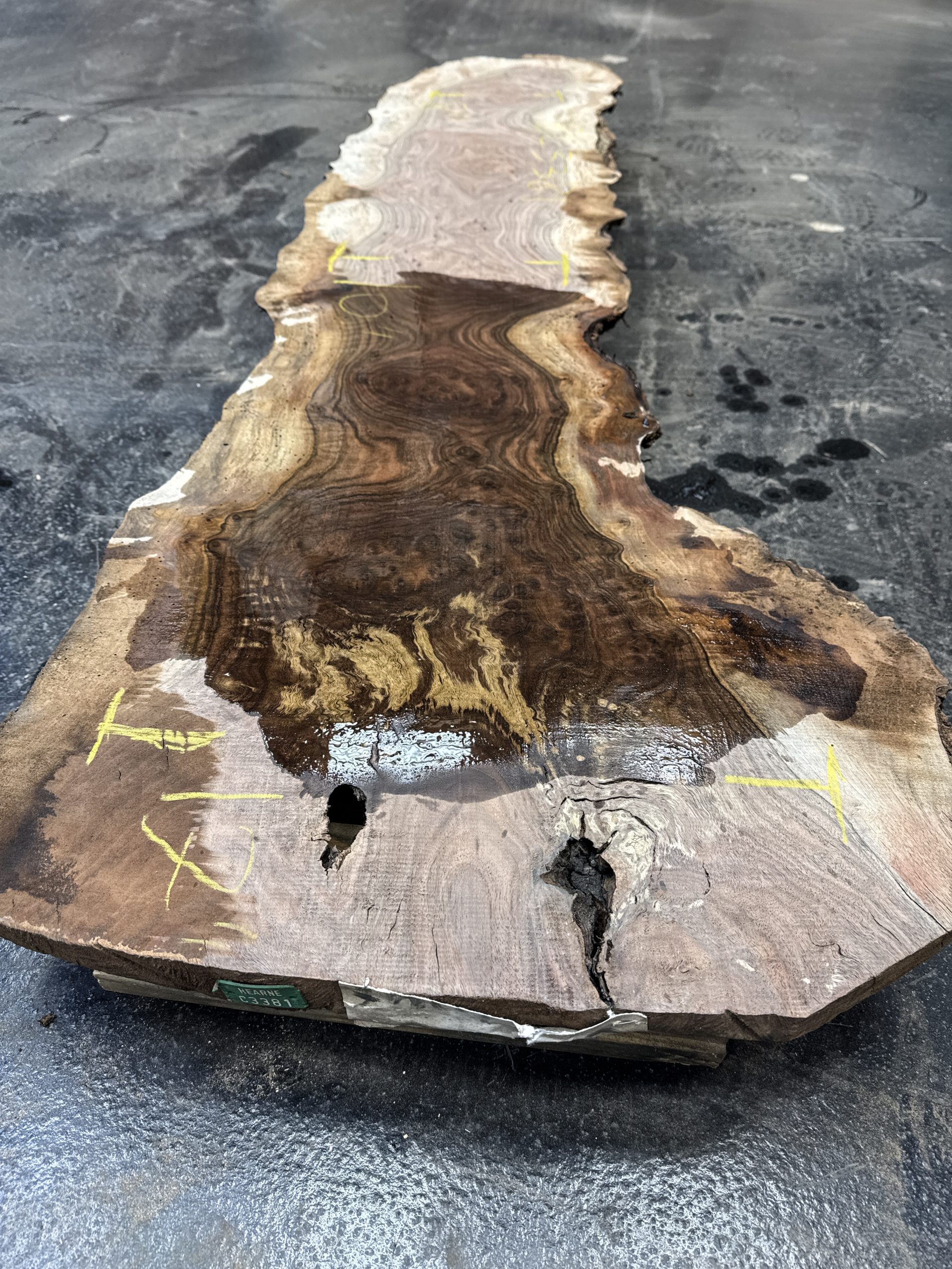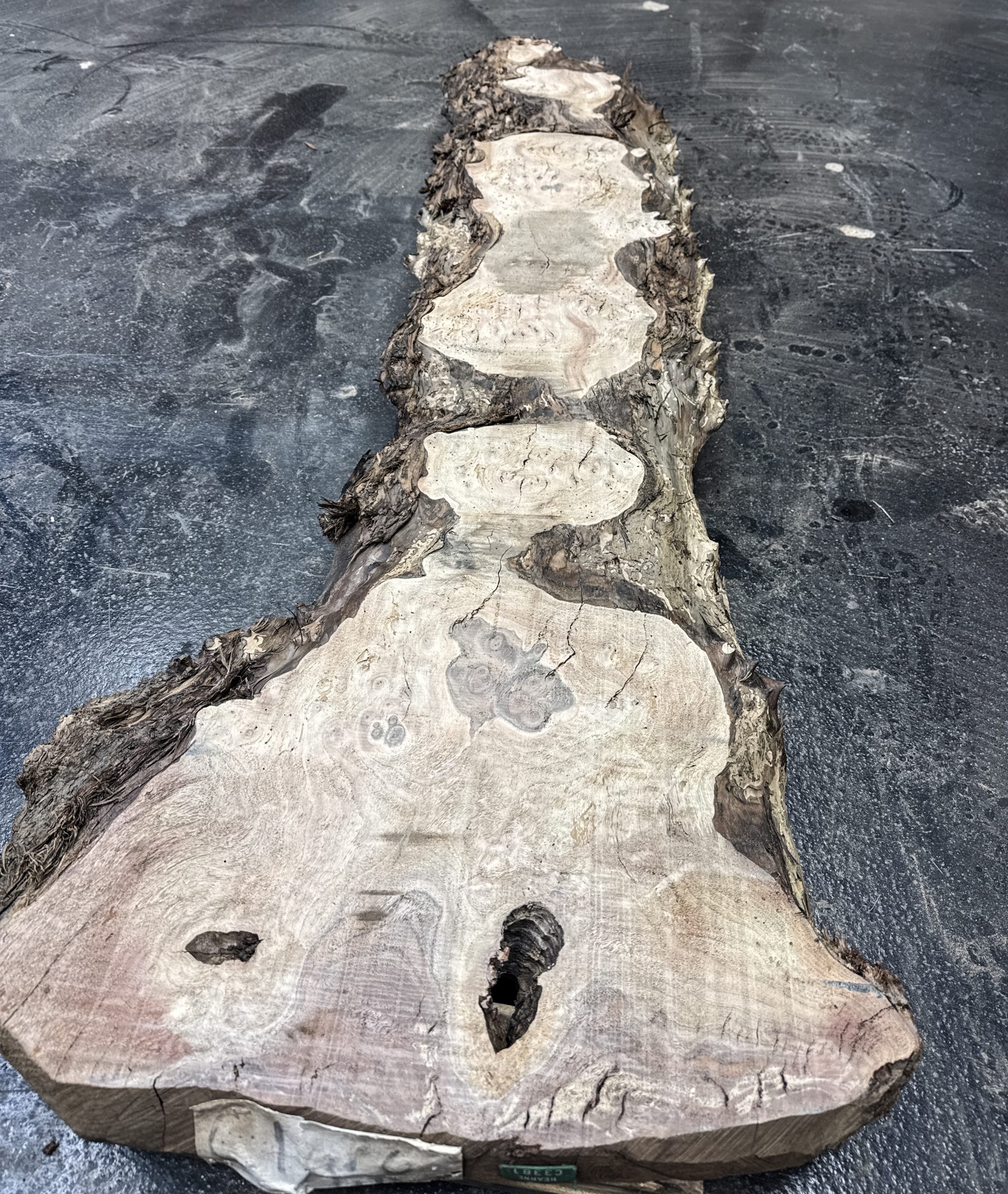 Outside slab with an interesting shape top face has some curly figure and some burl pockets back face is super sappy narrow and full of bug holes. Planed to 2.185″.