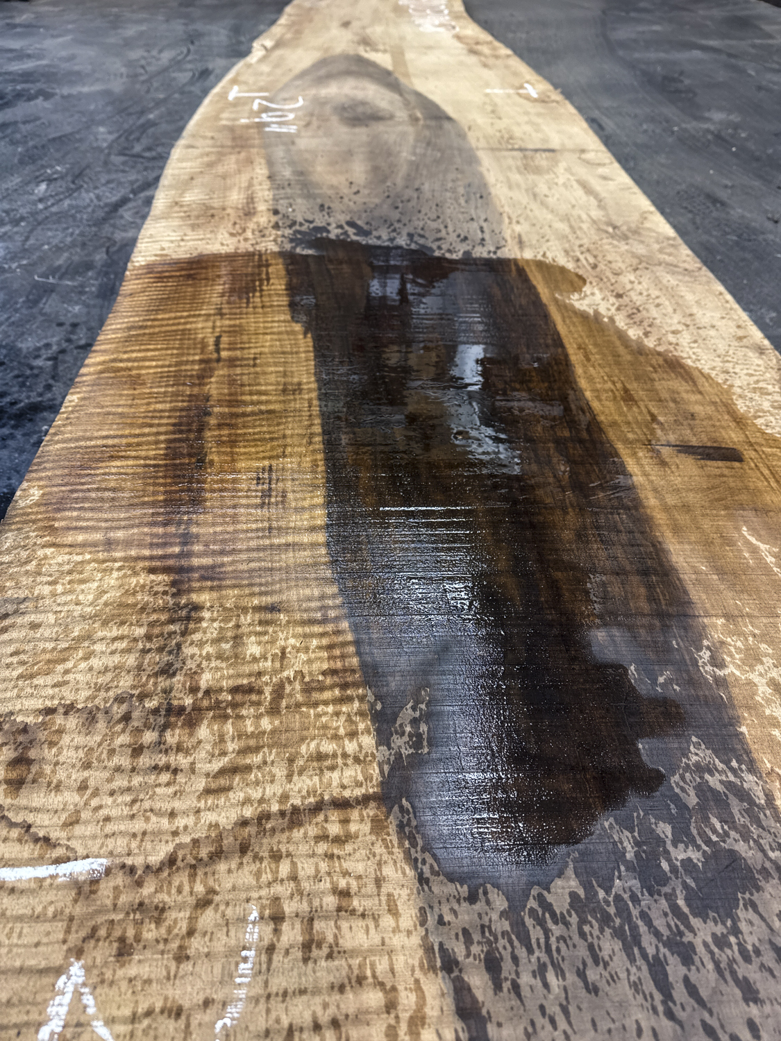 Beautiful slab with tight curly figure strongest in the bottom half and an interesting mix of heart and sapwood. Severe twist needs broken in half to be flattened.